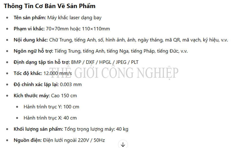 Công nghệ khắc laser bay (Flying Laser Marking): Không cần dừng sản phẩm khi in, phù hợp với dây chuyền tốc độ cao.