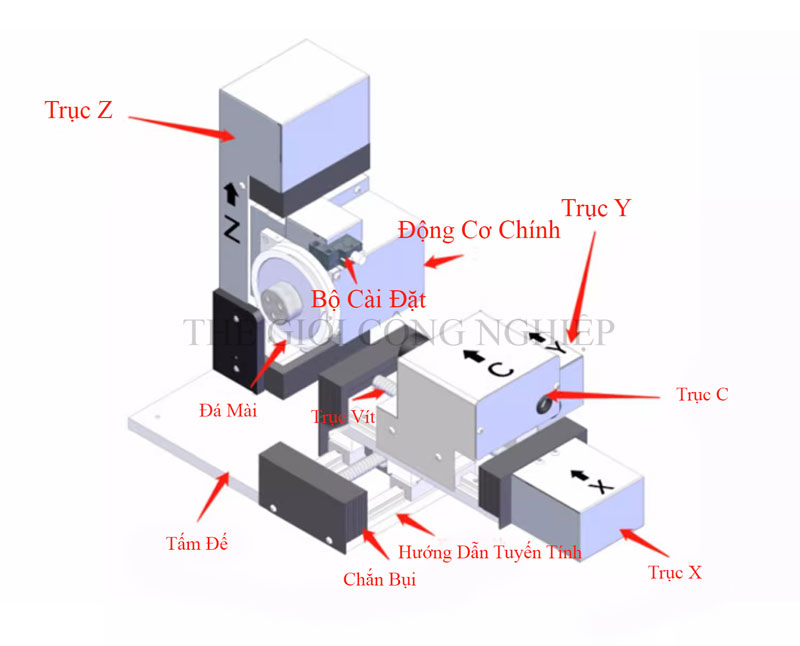Trục mài: Tích hợp hệ thống mài 4 trục do hãng tự phát triển, cho phép điều chỉnh góc và hướng mài chính xác.