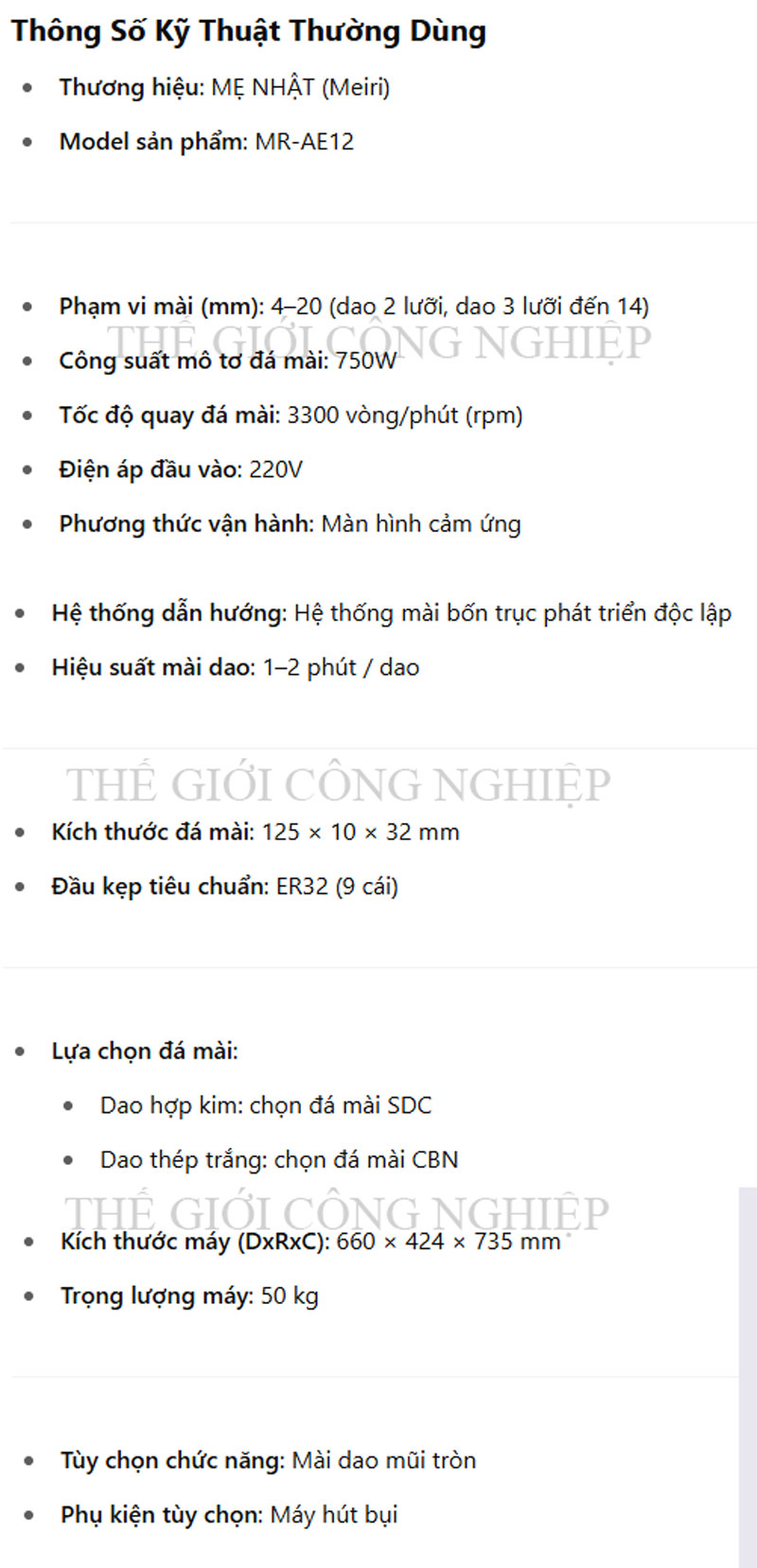 Đá mài: Được thiết kế thay thế nhanh, có thể tùy chọn giữa đá SDC (cho dao hợp kim) hoặc CBN (cho dao thép gió).