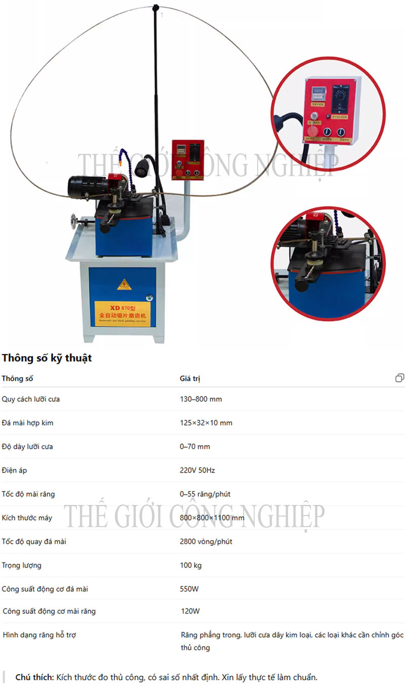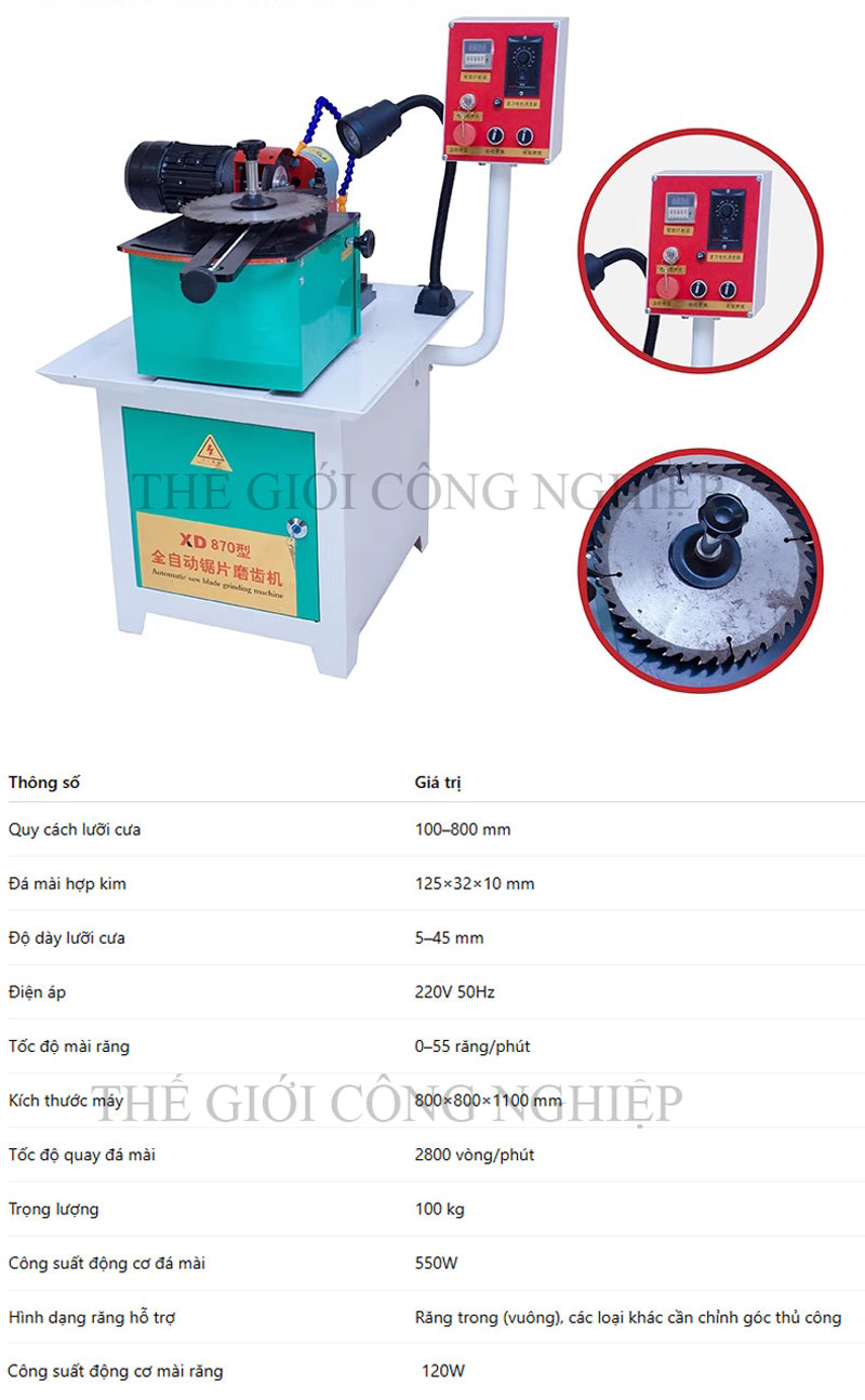 Cơ cấu gá lưỡi cưa: điều chỉnh được nhiều góc độ mài, hỗ trợ nhiều đường kính lưỡi (thường 100–800mm).