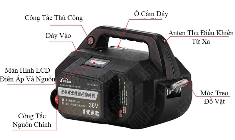 Sản phẩm đi kèm đầy đủ phụ kiện: máy chính, cáp 20m, 2 bộ điều khiển từ xa, 2 pin, khóa chữ D và 1 bộ sạc. Đây là thiết bị lý tưởng cho các công việc nâng hạ điều hòa ngoài trời, vận chuyển vật tư công trình, lắp đặt thiết bị trên cao… giúp tiết kiệm thời gian, công sức và nâng cao hiệu quả lao động.