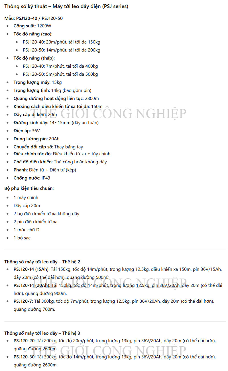 Dây cáp đi kèm dài 20m, đường kính 14–15mm, đảm bảo độ bền chắc và an toàn trong mọi điều kiện làm việc. Thiết bị sử dụng điện áp 36V với pin dung lượng 20AH, có thể hoạt động liên tục trên quãng đường dây lên tới 2800m, đồng thời hỗ trợ điều khiển từ xa trong phạm vi 150m.