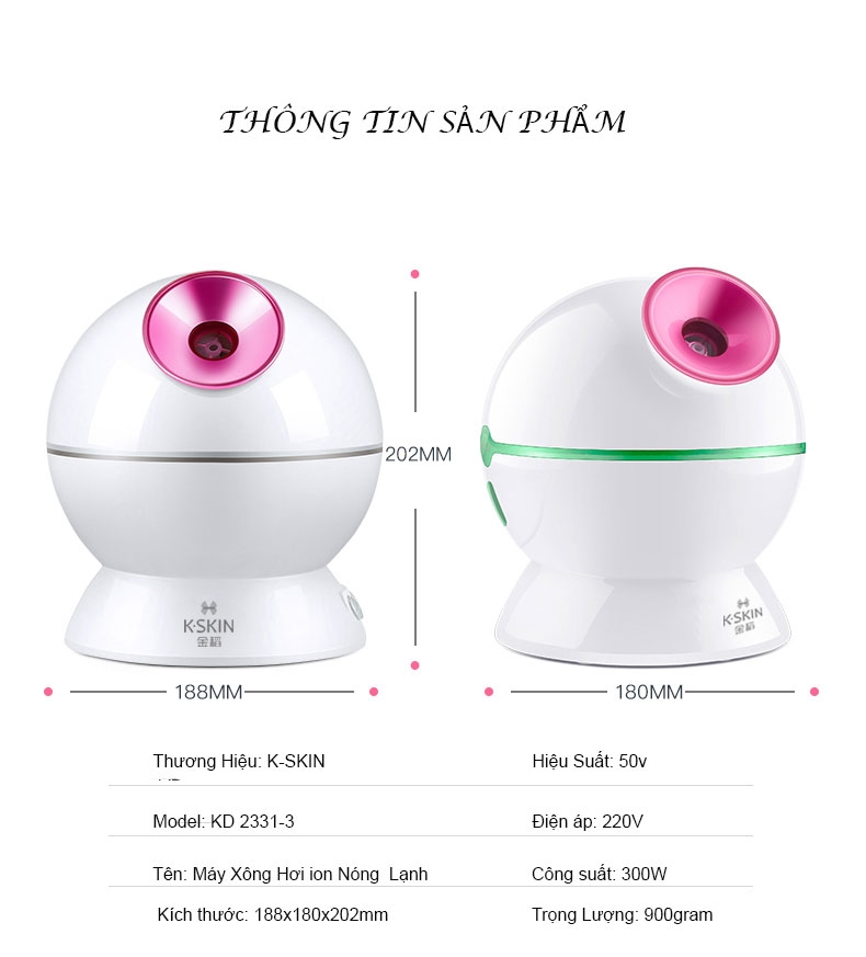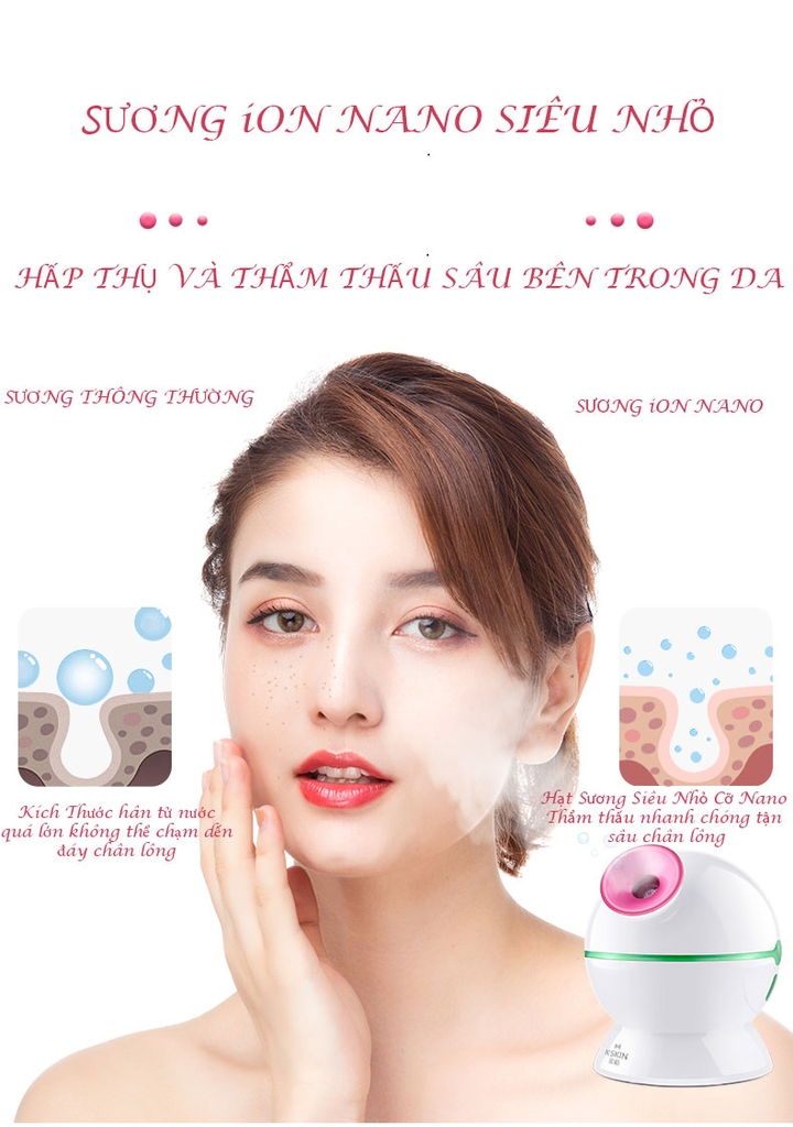 - Máy xông hơi da mặt K-SKIN ion nano Giúp tăng cường chuyển hóa tế bào collagen để sinh trưởng làn da mới, Tính năng PHUN SƯƠNG HẠT ION Nano siêu nhỏ và mịn nhanh chóng đi sâu vào lỗ chân lông và thuận tiện cho việc tẩy trang loại bỏ bụi bẩn, tạm chất bên trong lỗ chân lông và trên bề mặt da