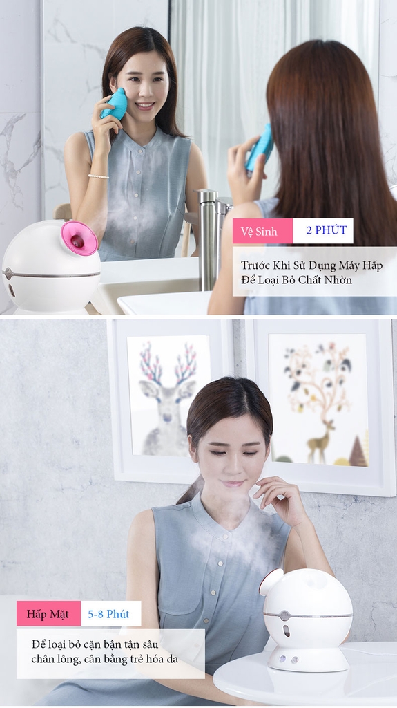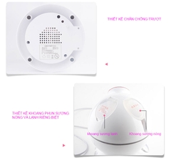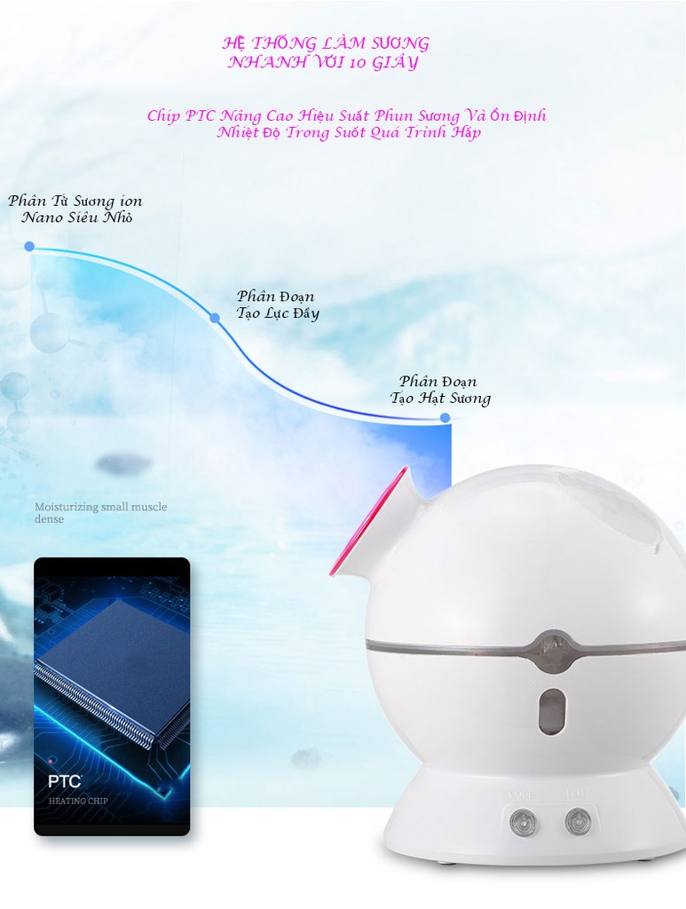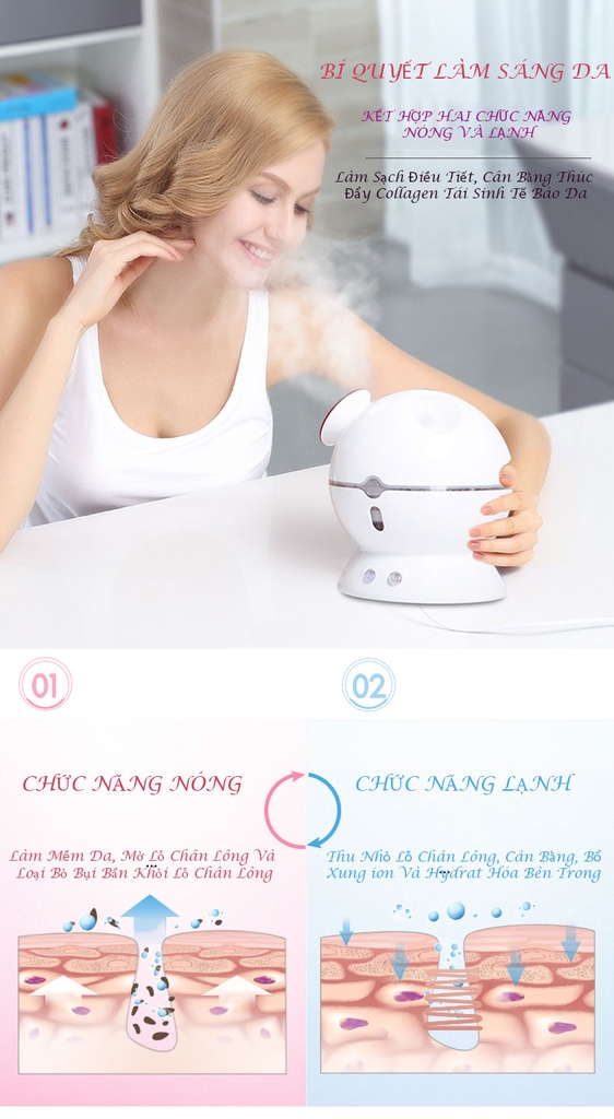 - Chức năng xông hơi nóng giúp Làm mềm lớp biểu bì tế bào chết MỞ LỖ CHÂN LÔNG tẩy trang phấn trang điểm đọng trên bề mặt làm tắc nghẽn lỗ chân lông ngăn nghừa viêm lang lông, giúp lưu thông và tăng cường tuần hoàn máu cho da