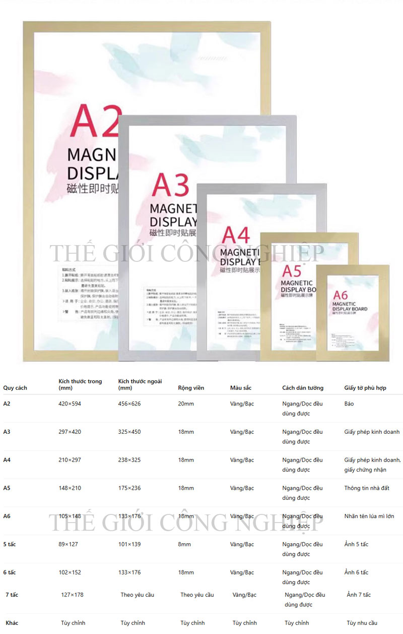 Khung được sản xuất với nhiều kích thước tiêu chuẩn như A2, A3, A4, A5, A6, 5 tấc, 6 tấc, 7 tấc, hoặc đặt theo yêu cầu riêng, phù hợp với đa dạng nhu cầu: