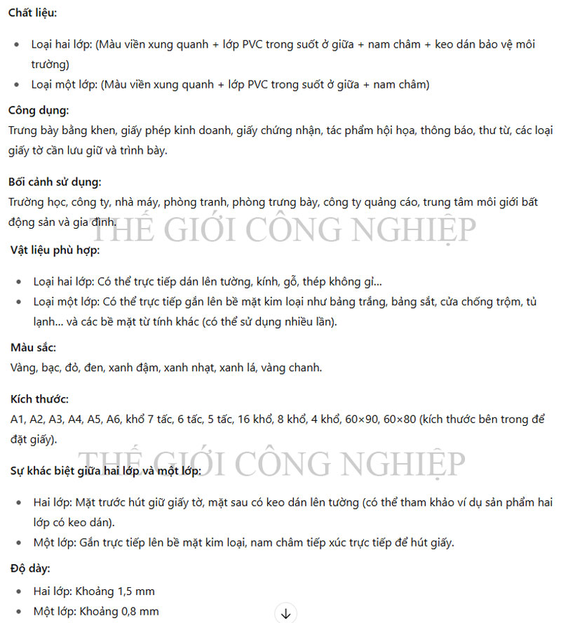 Viền khung có độ rộng từ 8–20mm tùy loại, màu sắc vàng hoặc bạc sang trọng, tạo điểm nhấn nổi bật cho tài liệu. Lớp PVC trong suốt chống bám bụi, chống xước, giữ nội dung bên trong luôn rõ nét. Lực từ ổn định giúp cố định chắc chắn ngay cả khi treo ở vị trí thường xuyên có người qua lại hoặc bị tác động rung nhẹ.