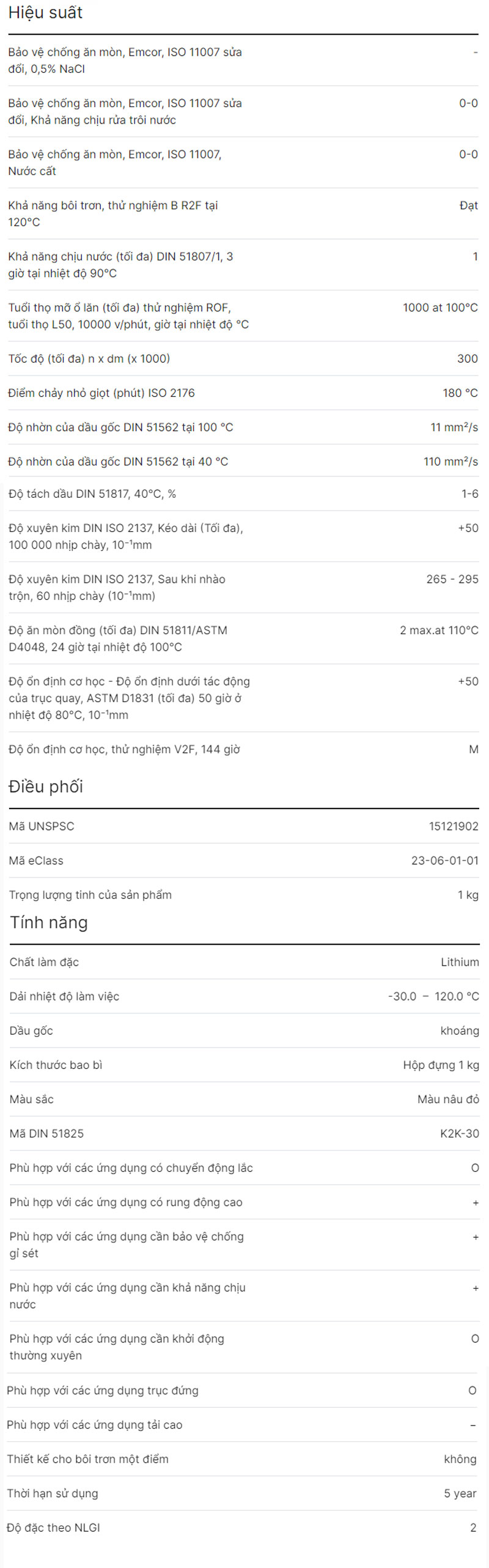 - Mỡ này cung cấp độ bền cao và khả năng làm việc ổn định trong phạm vi nhiệt độ rộng, từ -30°C đến +120°C.