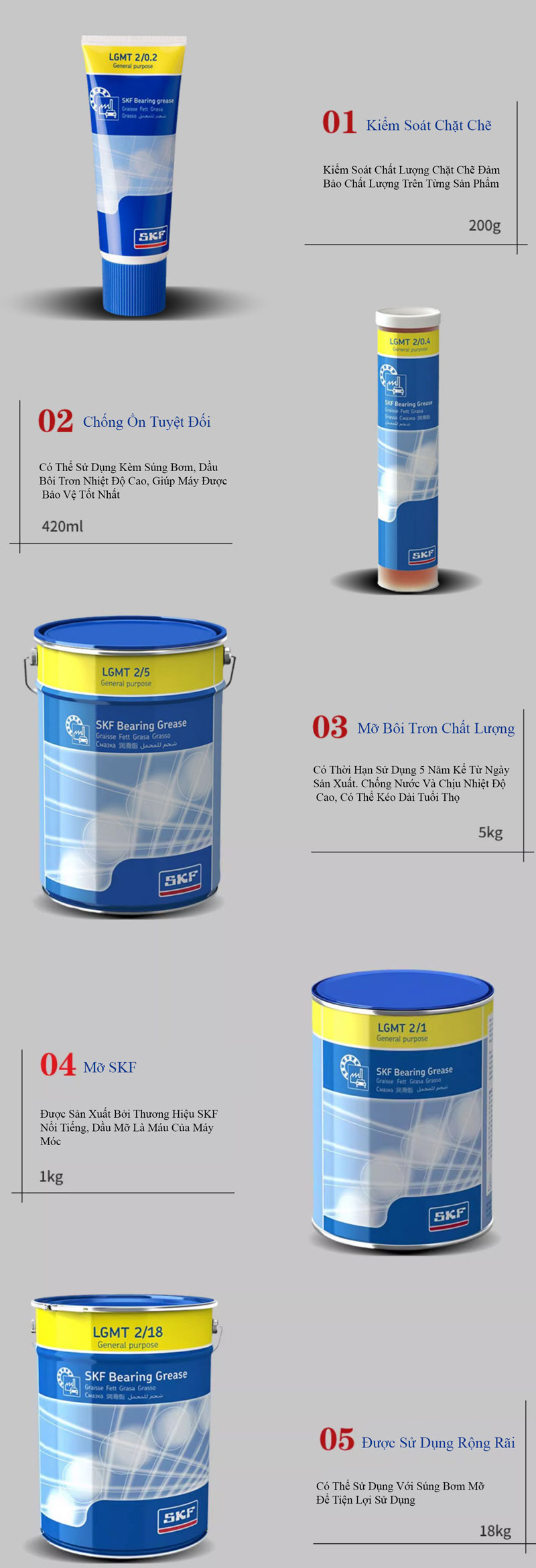 * Mỡ SKF LGMT 2 là loại mỡ bôi trơn gốc lithium có hiệu suất cao, được nhập khẩu và sản xuất bởi hãng SKF – một thương hiệu nổi tiếng toàn cầu về vòng bi và các giải pháp bôi trơn. LGMT 2 được thiết kế để đáp ứng nhu cầu bôi trơn cho nhiều loại ứng dụng trong công nghiệp và ô tô.