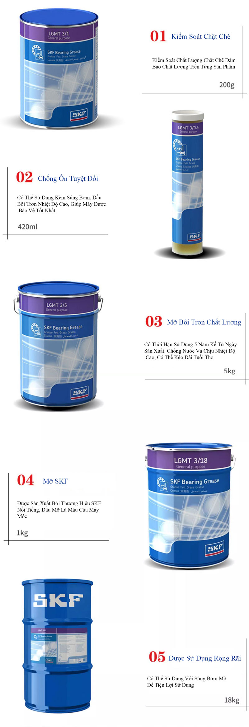 Mỡ SKF LGMT 3 là loại mỡ đa dụng, có khả năng chịu tải và nhiệt tốt, đặc biệt phù hợp với các ứng dụng công nghiệp và xe cơ giới yêu cầu độ bền cơ học cao. Với khả năng kháng nước và oxy hóa, mỡ LGMT 3 giúp bảo vệ thiết bị hiệu quả trong môi trường làm việc khắc nghiệt.