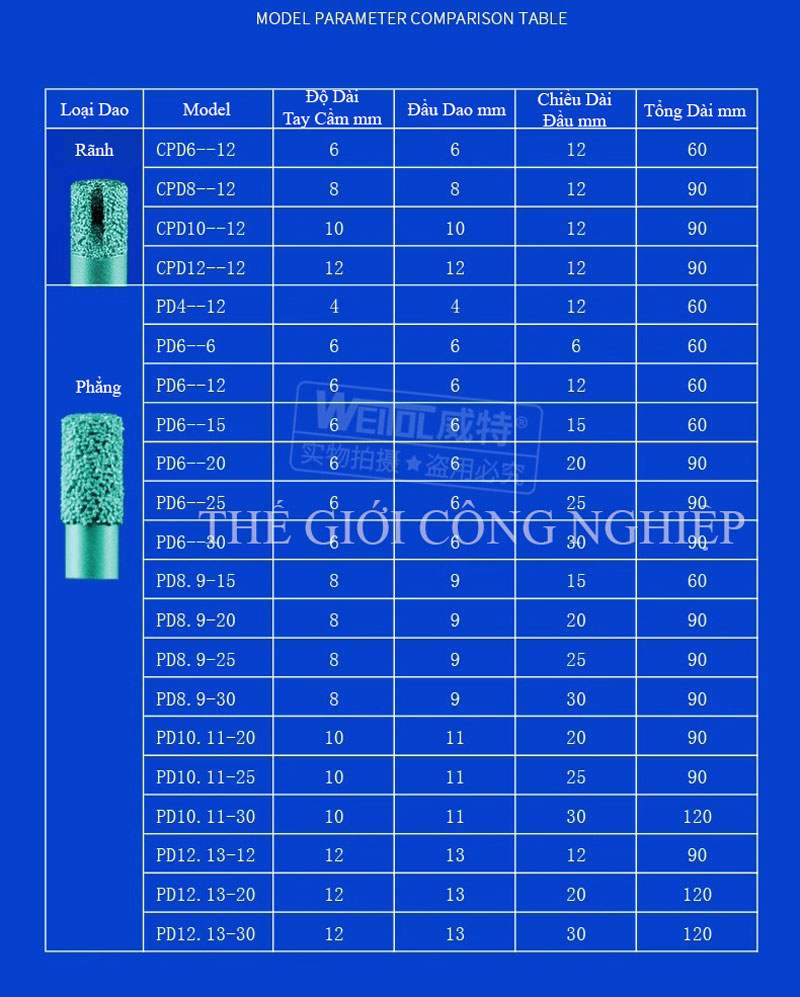 Sản phẩm được thiết kế với nhiều kiểu dáng khác nhau như mũi thẳng, mũi phẳng, mũi V, mũi cầu… nhằm đáp ứng đa dạng nhu cầu gia công: từ khắc chữ, chạm khắc hoa văn, khắc phù điêu 3D cho đến phay mặt phẳng, khoét rãnh hoặc tạo hình chi tiết phức tạp. Đặc biệt, lưỡi dao sắc bén cho đường khắc mịn, hạn chế nứt vỡ đá và đảm bảo độ chính xác cao.