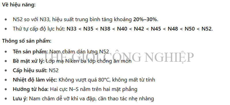 Với cấp lực từ N52, nam châm có khả năng hút giữ cực mạnh, cố định chắc chắn các vật nặng trong không gian nhỏ gọn. Ứng dụng đa dạng: dùng trong lắp ráp linh kiện điện tử, cơ khí chính xác, làm đồ thủ công DIY, treo bảng ghi chú, gắn cố định vật dụng trong gia đình, văn phòng, xưởng sản xuất hay thiết kế sáng tạo.