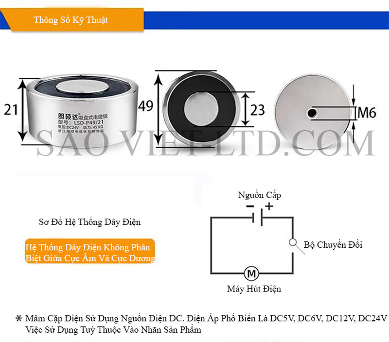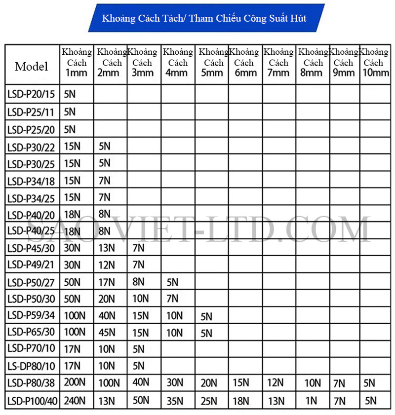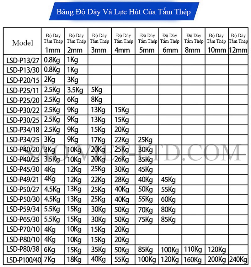Lực hút: Từ vài kg đến trên 100kg tùy theo kích thước (VD: D50mm có thể hút ~50kg trong điều kiện lý tưởng).