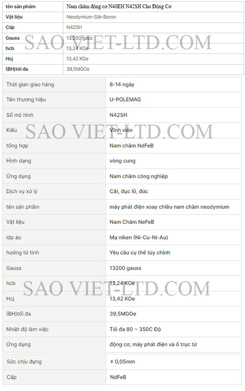 Nam châm động cơ N40EH và N42SH là dòng nam châm đất hiếm Neodymium (NdFeB) hiệu suất cao, chuyên dùng trong các loại động cơ tốc độ cao, công suất lớn hoặc làm việc trong môi trường nhiệt độ cao. Với khả năng giữ từ ổn định ở nhiệt độ lên đến 180–200°C, các loại nam châm này là lựa chọn lý tưởng cho động cơ không chổi than (BLDC), servo motor, máy phát, và thiết bị công nghiệp chính xác.