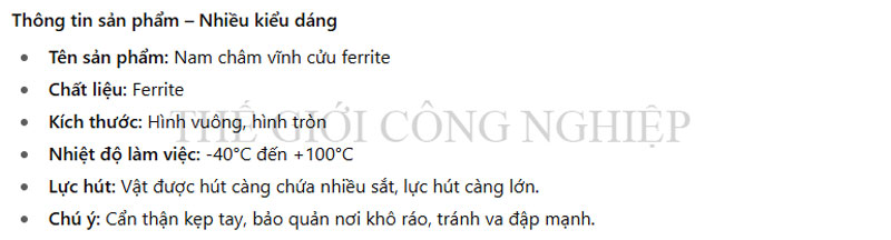Vật liệu ferrite bền, chống gỉ và mài mòn.