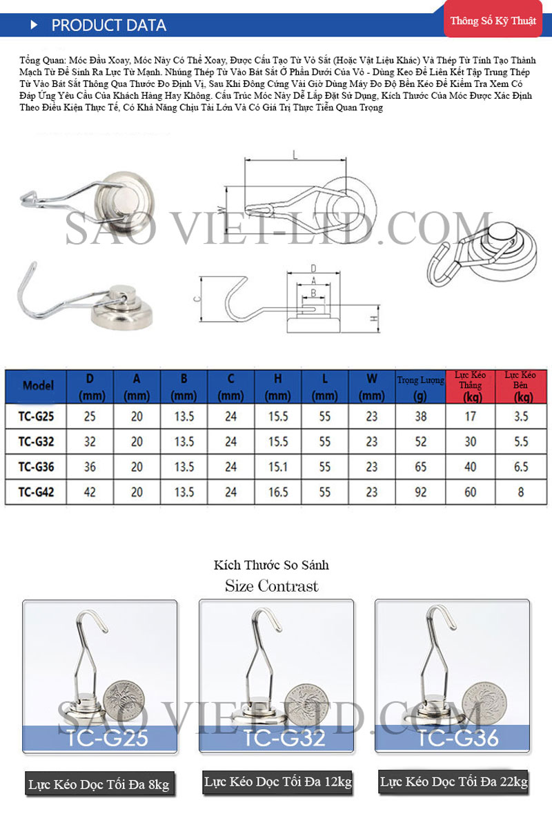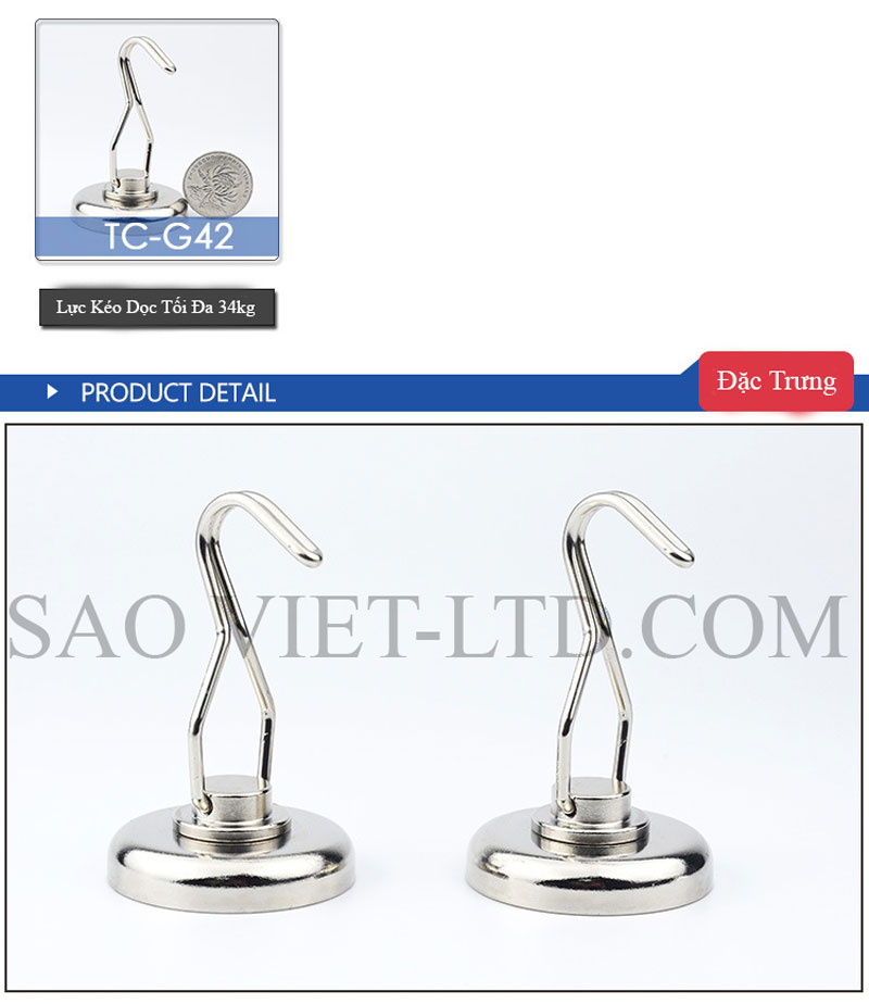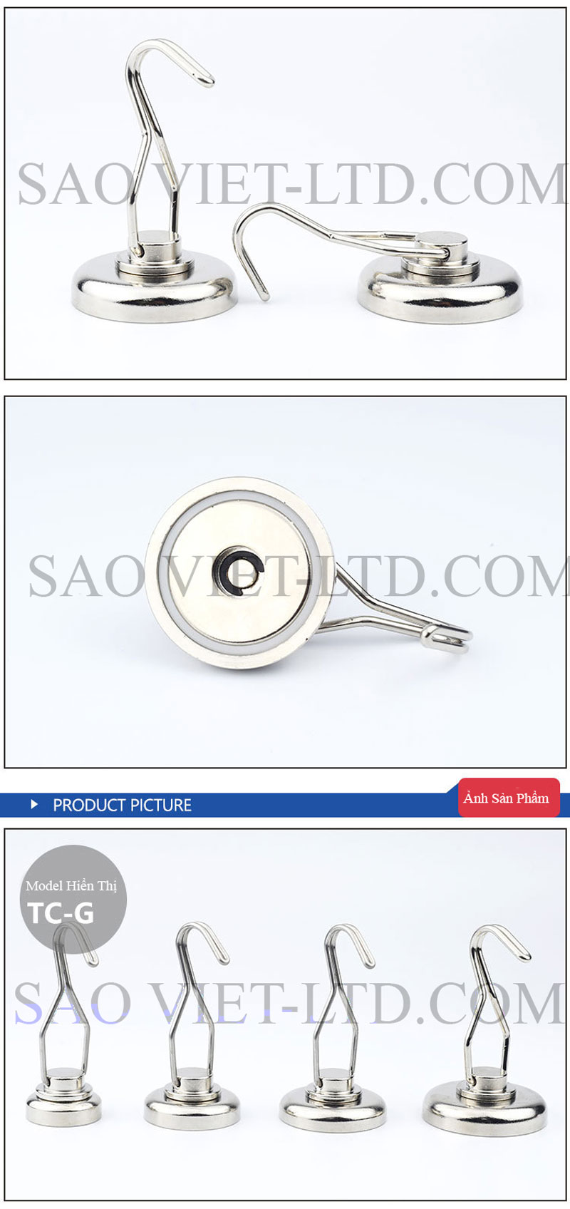 Phần móc treo được làm từ thép không gỉ hoặc hợp kim mạ crom sáng bóng, có khả năng xoay 360° và gập 180°, cho phép treo vật dụng ở nhiều góc độ khác nhau, linh hoạt trong không gian hẹp. Móc treo được liên kết chắc chắn với đế nam châm, chịu tải trọng từ vài kg đến hàng chục kg tùy kích thước và lực từ của nam châm.