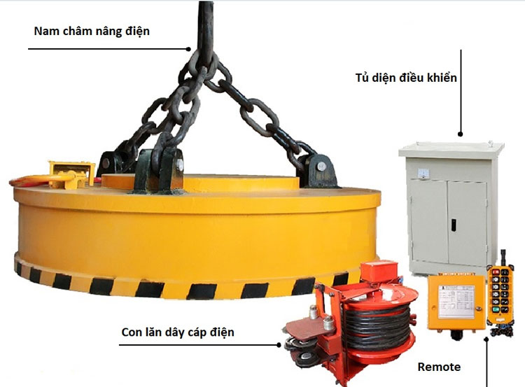 Nếu là các thép phế liệu hoặc sắt vụn, ta di chuyển nam châm đến đó và bắt đầu bật nguồn bằng remote điều khiển. Khi bật, dòng điện sẽ chạy qua mâm nam châm và sinh ra từ trường. Nam châm bắt đầu hoạt động sẽ hút tất cả các sắt hoặc các vật liệu từ tính lên. Sau đó di chuyển xe cẩu hoặc cầu trục đến nơi cần đặt, di chuyển nhẹ nhàng và tránh lắc mạnh vì sẽ dễ bị rơi các tấm sắt nhỏ trên đường đi. Sau khi đến nơi cần đặt. Bấm nút Off trên remote điều khiển, các sắt vụn sẽ rơi ra hoàn toàn và bắt đầu cho những lần tiếp theo.