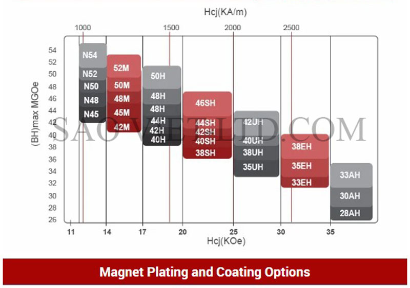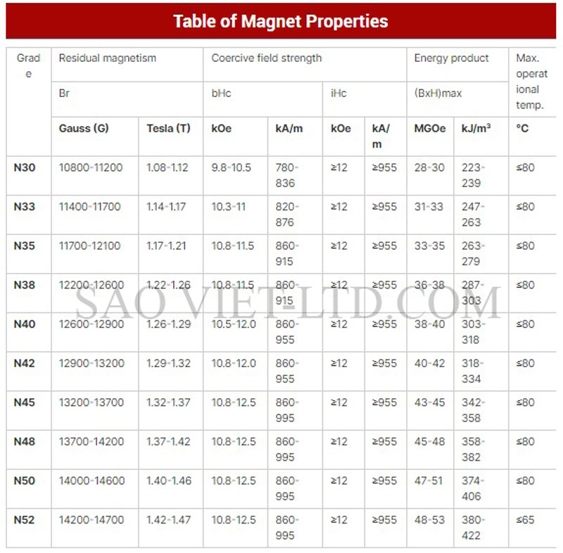 Vật liệu: Neodymium – Sắt – Boron (NdFeB), cấp từ N35, N38, N42, N45, N52