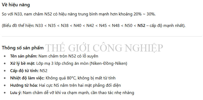 Nam châm được sản xuất theo công nghệ ép kết dính và xử lý bề mặt bằng lớp mạ 3 lớp Niken – Đồng – Niken, giúp chống oxy hóa, hạn chế han gỉ và duy trì khả năng từ tính ổn định ngay cả trong điều kiện môi trường ẩm hoặc khắc nghiệt. Đặc tính của nam châm N52 là lực hút cực mạnh trên một diện tích nhỏ, do đó sản phẩm có thể kẹp giữ, nâng đỡ hoặc hút cố định các vật kim loại có trọng lượng lớn hơn nhiều lần so với kích thước thực tế.