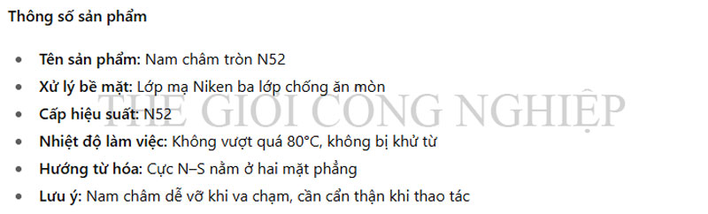 Ưu điểm nổi bật của loại nam châm này là kích thước nhỏ gọn nhưng sinh ra lực hút mạnh mẽ, dễ lắp đặt, tái sử dụng và mang lại hiệu quả vượt trội so với các loại nam châm thông thường. Đây là lựa chọn tối ưu cho các ứng dụng yêu cầu lực từ cao, độ bền lâu dài và tính ổn định trong hoạt động.
