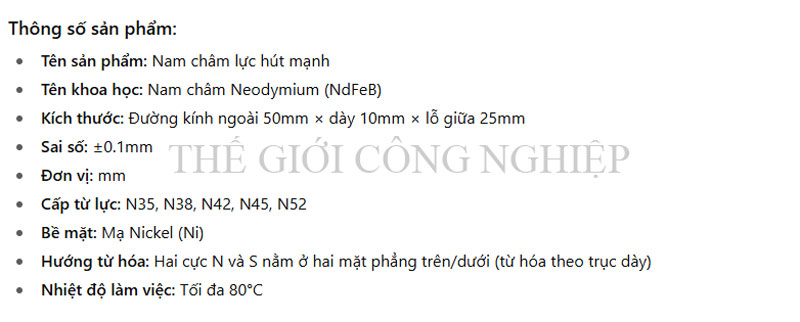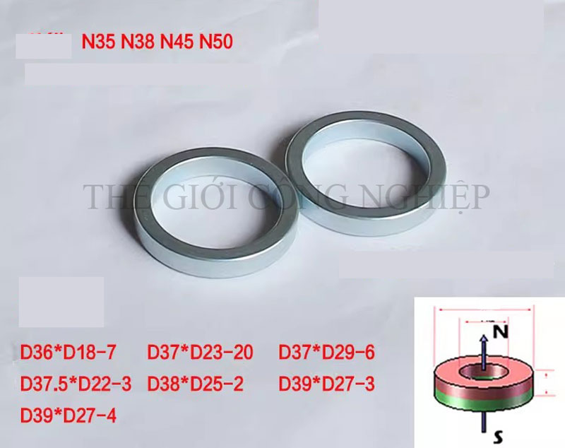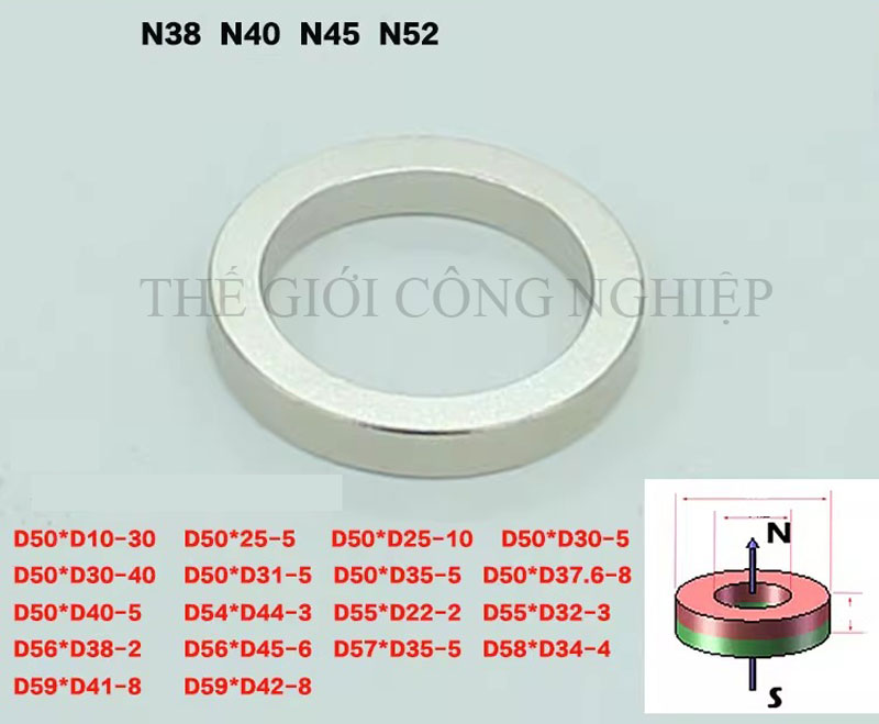 Nam châm vòng tròn Neodymium (NdFeB) có lỗ xuyên tâm là loại nam châm vĩnh cửu có từ tính mạnh nhất hiện nay, được thiết kế dạng vòng tròn rỗng với các đường kính phổ biến từ Φ50 đến Φ59mm, phù hợp cho các ứng dụng cần lực hút cao, gắn trục, bu lông hoặc cố định bằng vít.