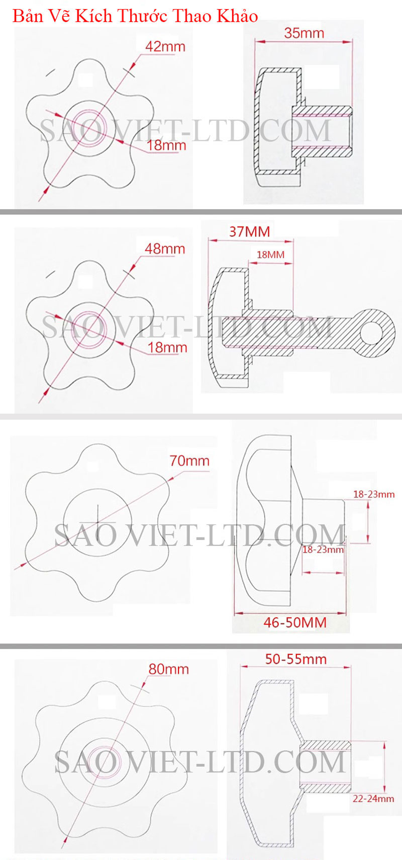 Hình dạng hoa mận (5 hoặc 6 cánh), thiết kế công thái học giúp cầm nắm dễ dàng, siết chặt hoặc tháo lỏng bằng tay không cần dụng cụ.