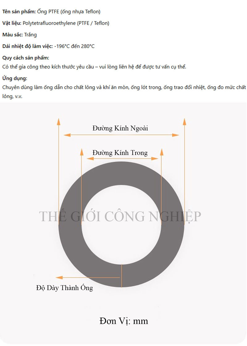 Ống được chế tạo từ vật liệu Polytetrafluoroethylene (PTFE) nguyên sinh, còn gọi là nhựa Teflon – một loại polymer có tính ổn định hóa học và cơ học cao. Bề mặt trong và ngoài của ống nhẵn bóng, giảm ma sát và chống bám dính tốt.