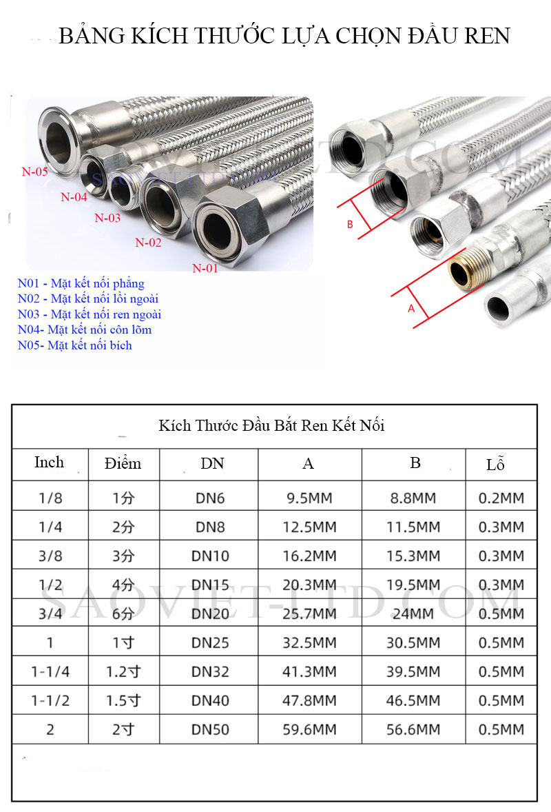 | Lớp ngoài | Lưới bện Inox 304 / Inox 316 |