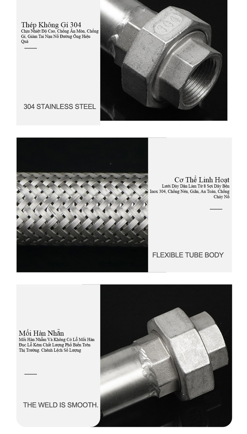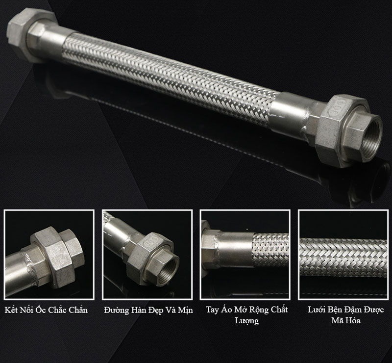 Khớp nối mềm kim loại là loại khớp nối có cầu tạo ống mềm Inox (inox 304, Inox 316, 321), lưới bọc là Inox 304 (hay còn gọi là thép không gỉ SUS 304, 316, 321). và phụ kiện kết nối: Inox 304/316, thép, gang hoặc vật liệu khác.