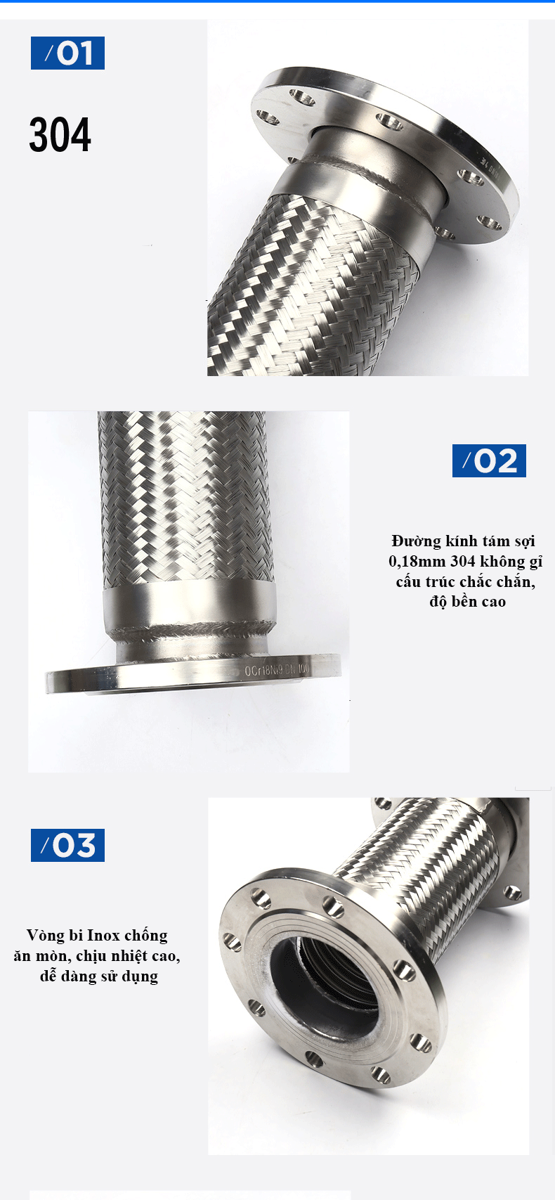 - Thân khớp nối được làm từ inox, chống rỉ tốt, chât liệu thep không rỉ. Chiểu dài thân tuy theo nhu cầu sủ dụng. Thường được đặt vị trí thẳng hoặc cong nhưng với góc độ nhất định được cho phép.
