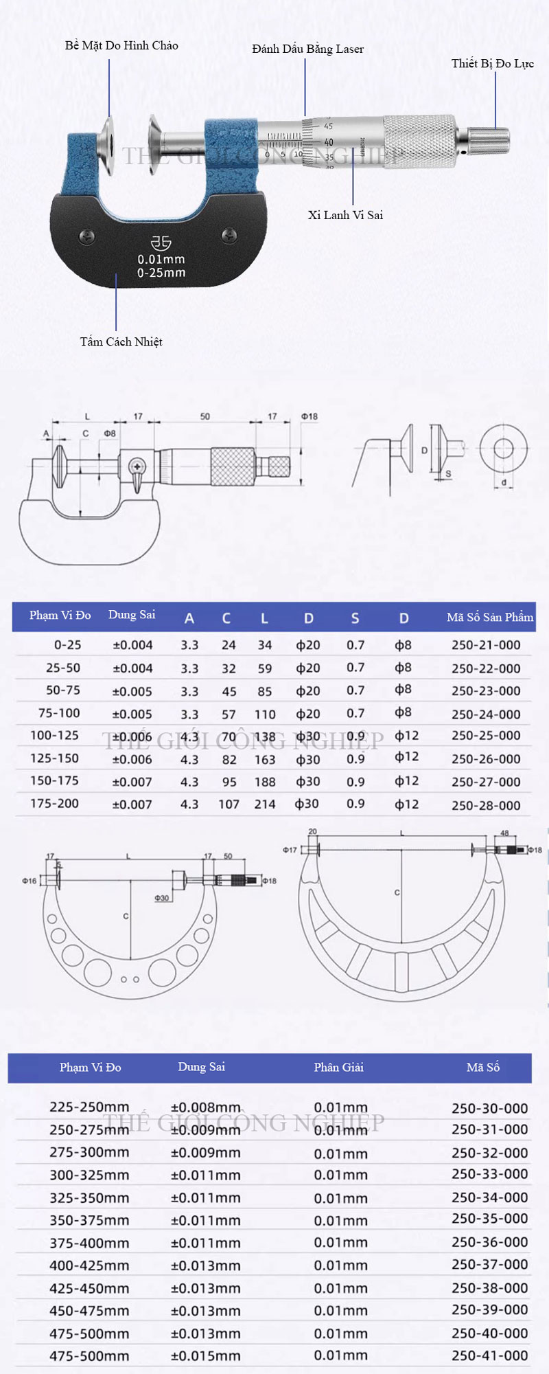 | 0-25mm | ±0.01mm | 0.01mm | Hợp kim carbide | Cơ khí/Digital |