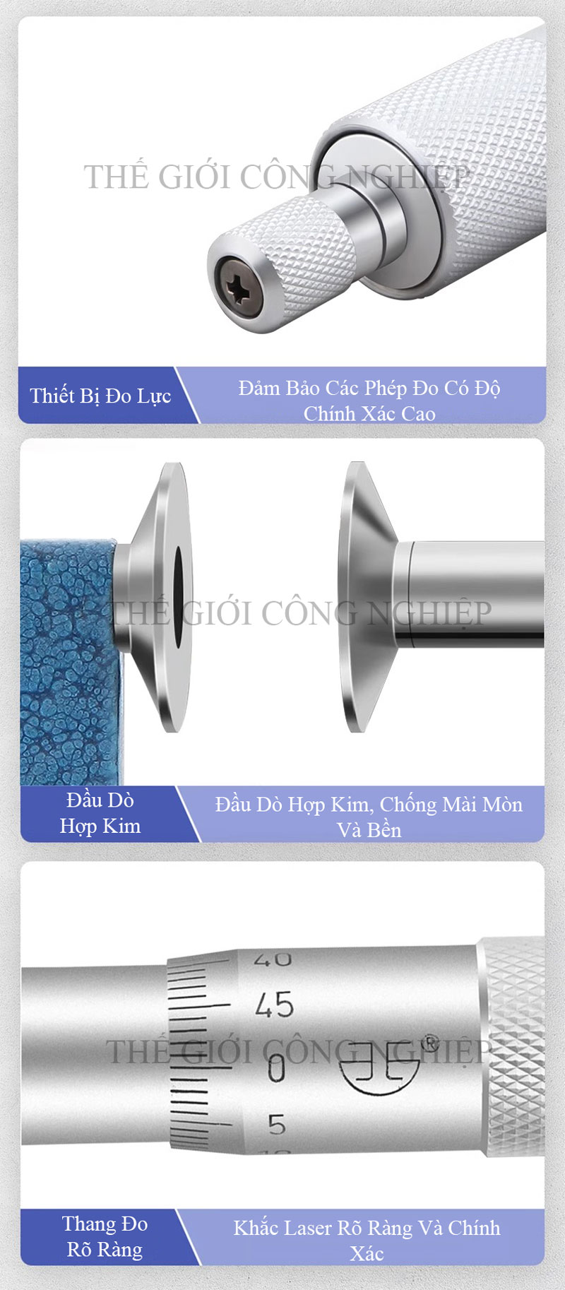 | 25-50mm | ±0.01mm | 0.01mm | Hợp kim carbide | Cơ khí/Digital |