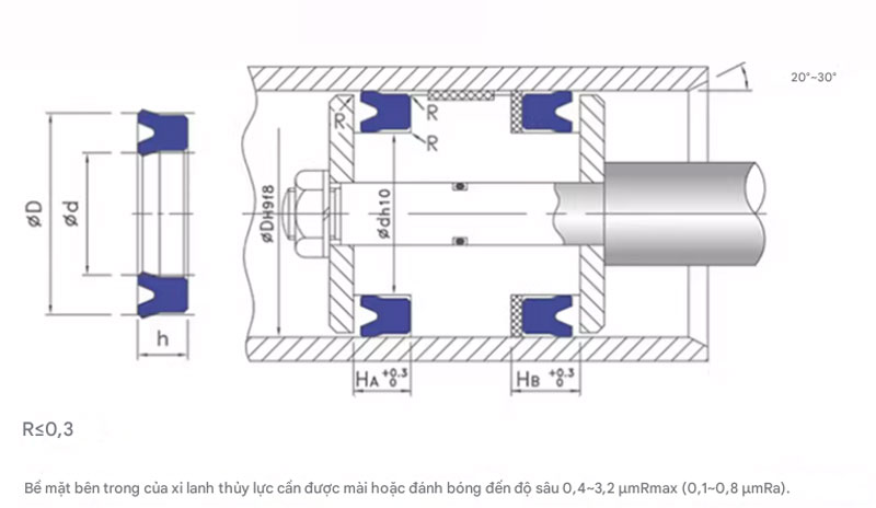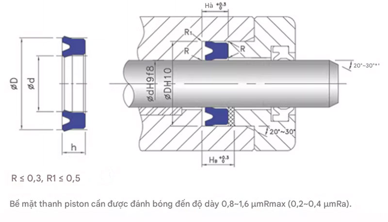 Khi áp suất dầu tác động, mép chữ U của phớt bị ép mở, tăng lực ép lên bề mặt ty và rãnh lắp.