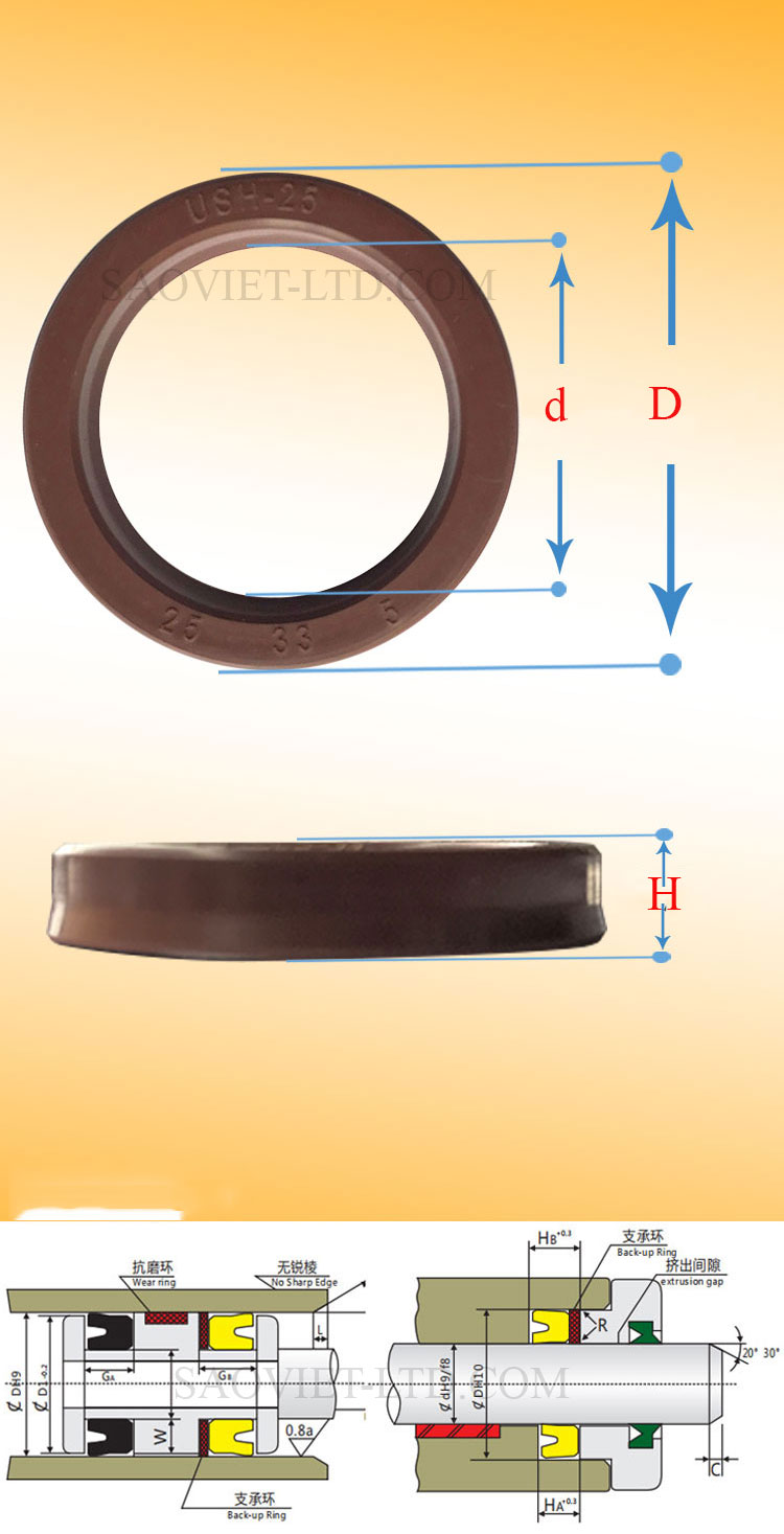 Phớt thủy lực Viton chịu nhiệt độ cao USH là loại phớt làm kín chuyên dụng trong các hệ thống thủy lực – khí nén, được thiết kế để làm việc ổn định trong điều kiện nhiệt độ cao, áp suất lớn và môi trường dầu – hóa chất khắc nghiệt. Dưới đây là mô tả chi tiết:
