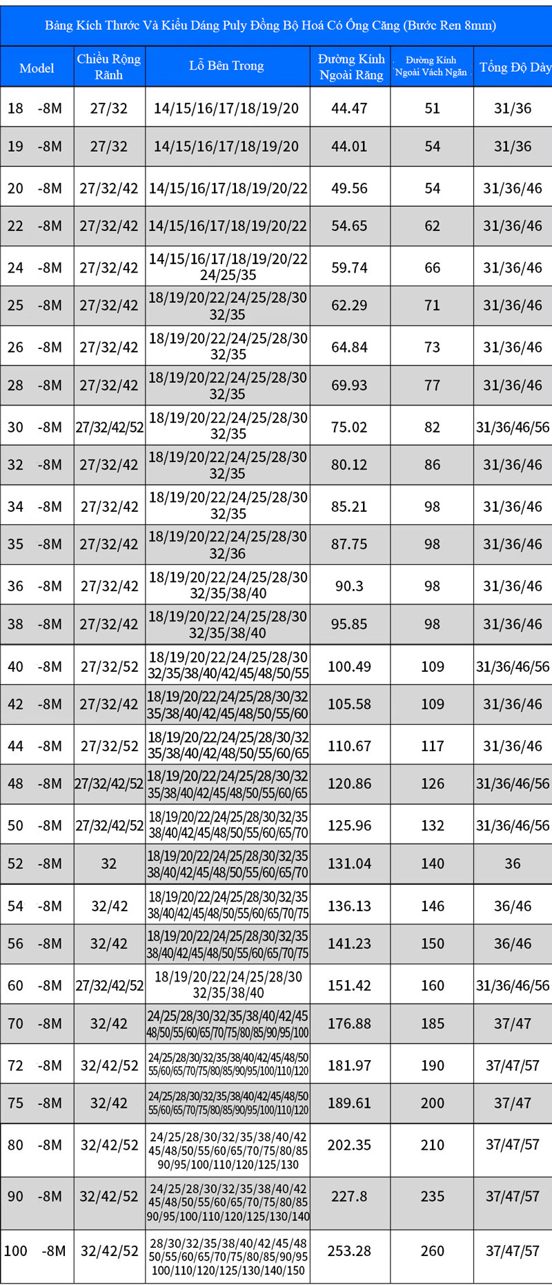 Thiết kế răng chuẩn 8M đảm bảo ăn khớp với dây đai răng, giảm rung động và tiếng ồn.