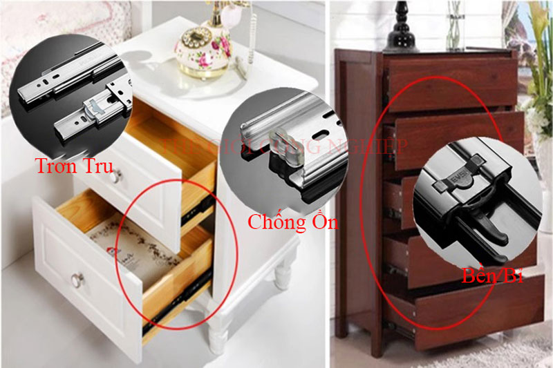 - Bi trượt: Sử dụng hệ thống bi thép không gỉ chất lượng cao, giúp giảm ma sát và tăng độ bền.