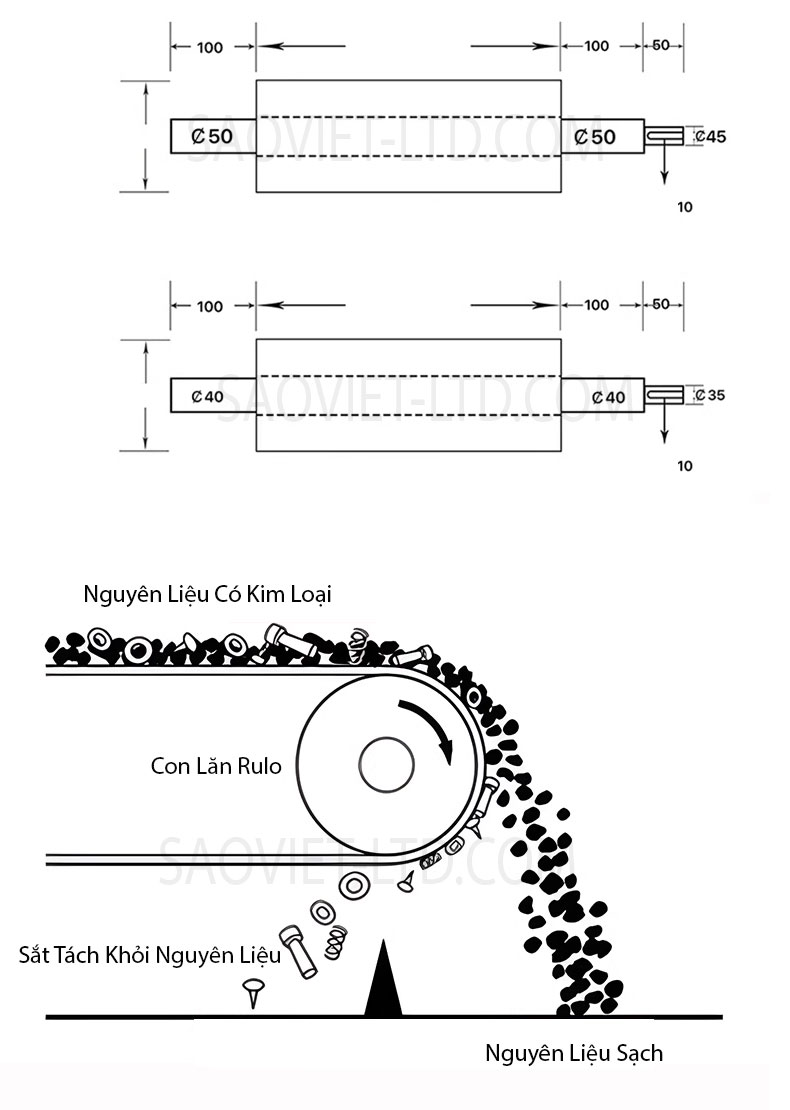 Trục quay: Gắn trực tiếp vào cuối băng tải, hoạt động như một con lăn kéo, vừa vận chuyển vừa lọc sắt.