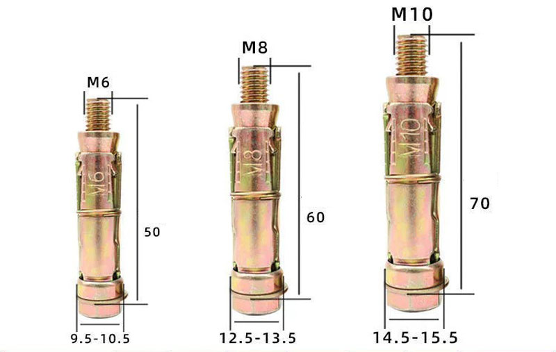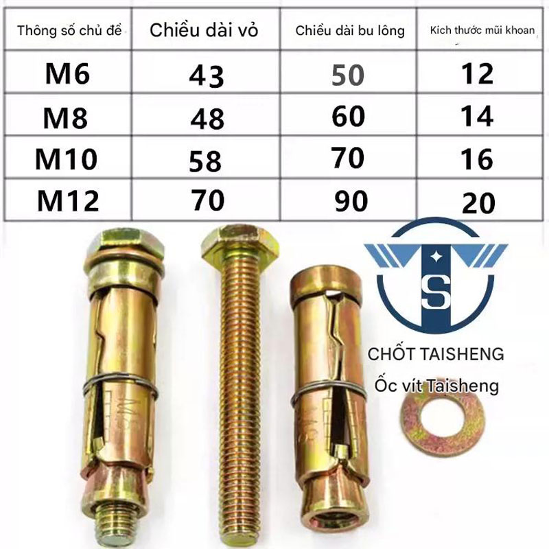 - Cấu tạo gồm: thân bu lông, ống nở 3 mảnh, đai ốc và vòng đệm