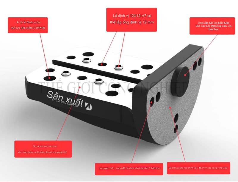 Bốn trục kẹp: - Tấm cầu có thiết kế với bốn trục kẹp linh hoạt, cho phép điều chỉnh và kẹp chặt các chi tiết gia công một cách dễ dàng. Những trục này giúp tạo ra sự ổn định tối đa, giảm thiểu rung lắc và sai lệch khi thao tác.