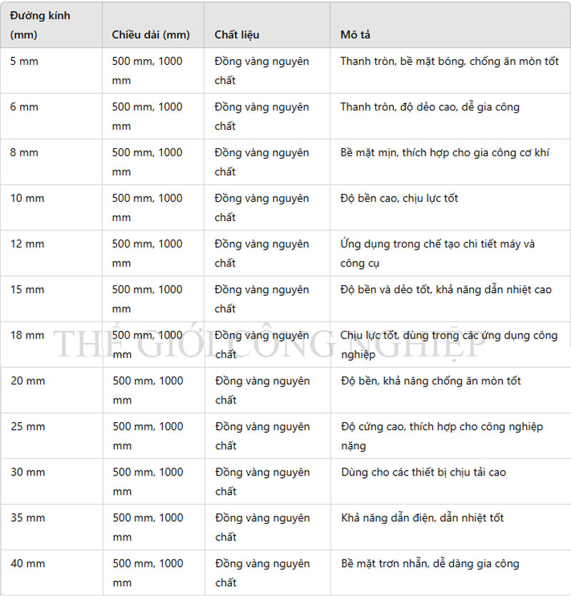 Thanh đồng vàng tròn nguyên chất là loại vật liệu kim loại được làm từ hợp kim của đồng với một lượng nhỏ kẽm, giúp tăng cường độ bền và khả năng chống ăn mòn. Đồng vàng có màu vàng sáng, độ sáng bóng cao, và bề mặt nhẵn mịn, đem lại vẻ ngoài thẩm mỹ và dễ nhận diện. Loại thanh tròn này thường được sản xuất với các kích thước đường kính và độ dài khác nhau, phù hợp cho nhiều ứng dụng trong các ngành công nghiệp, cơ khí và trang trí nội thất.