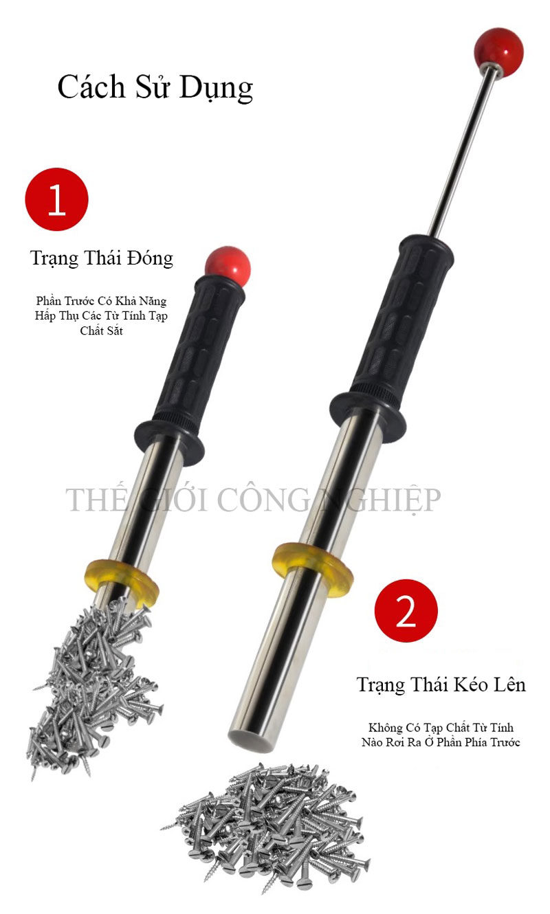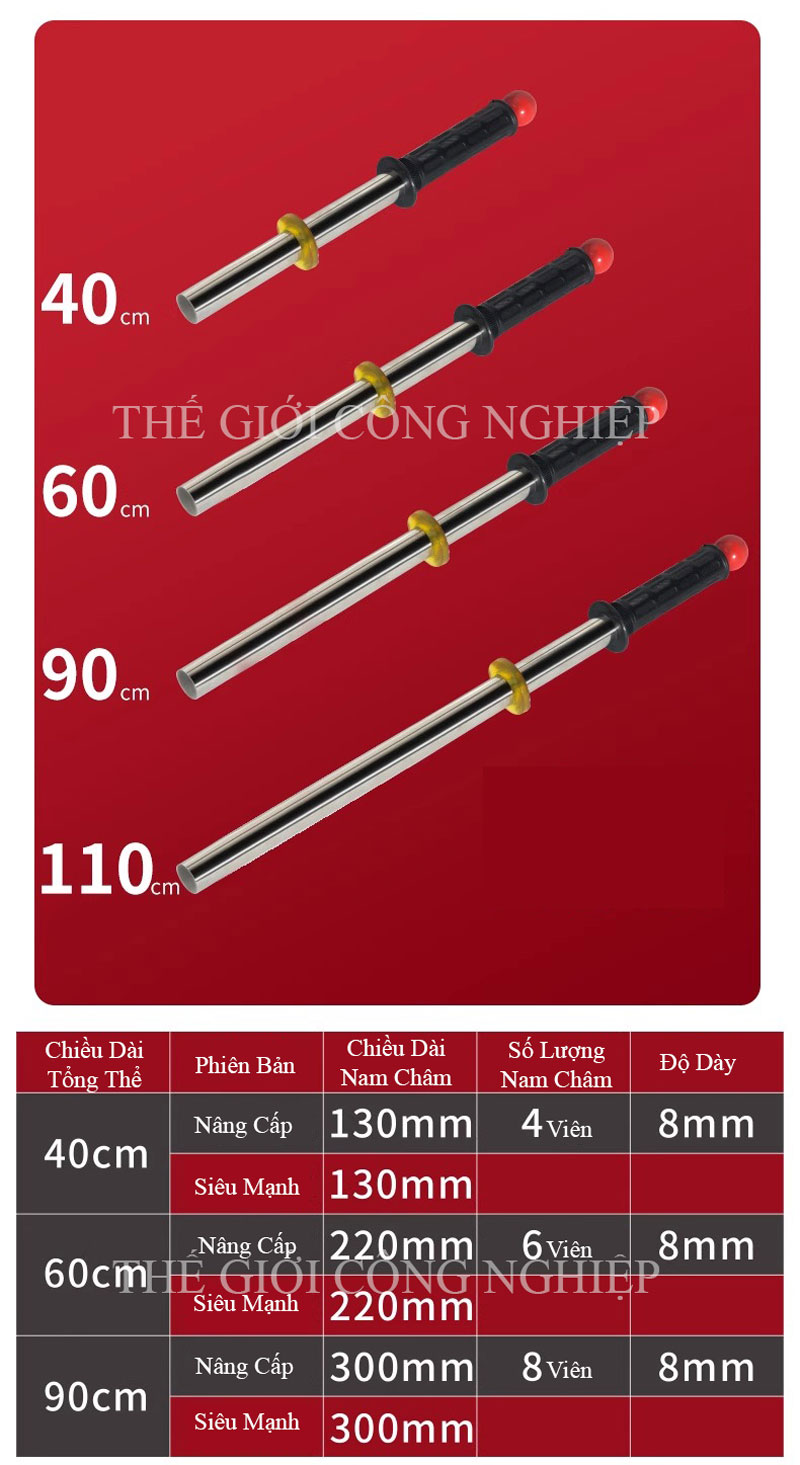 Thiết kế tay cầm kéo – nhả thông minh: khi cần thu gom, nam châm sẽ hút mạnh các vật liệu sắt thép; khi cần thả, chỉ cần kéo tay cầm để đẩy vật liệu ra nhanh chóng, sạch sẽ, không cần tiếp xúc trực tiếp. Có nhiều kích thước chiều dài (40cm, 60cm, 90cm, 110cm) và hai phiên bản mạnh và siêu mạnh, phù hợp nhu cầu từ xưởng nhỏ đến công nghiệp nặng.