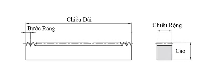 | Chiều rộng | Chiều cao | Bước răng | Chiều sâu răng | Chiều dài |