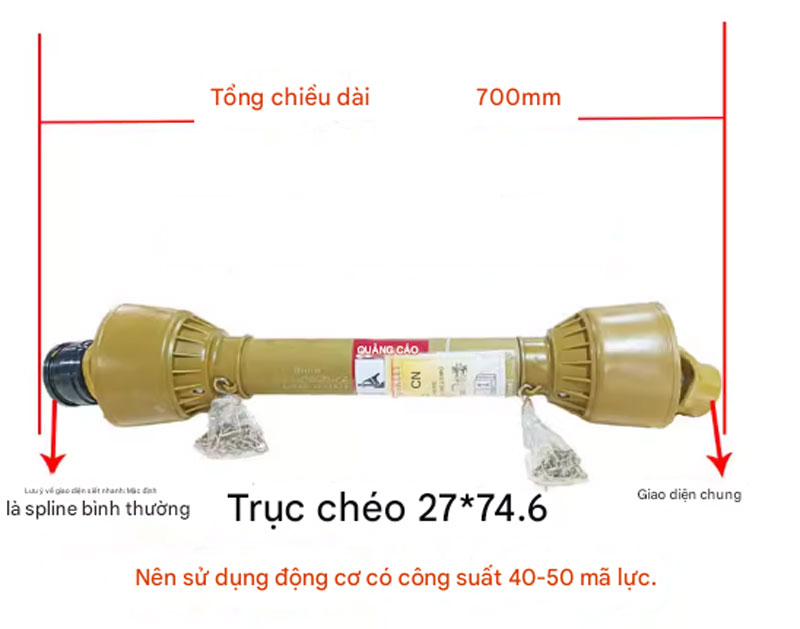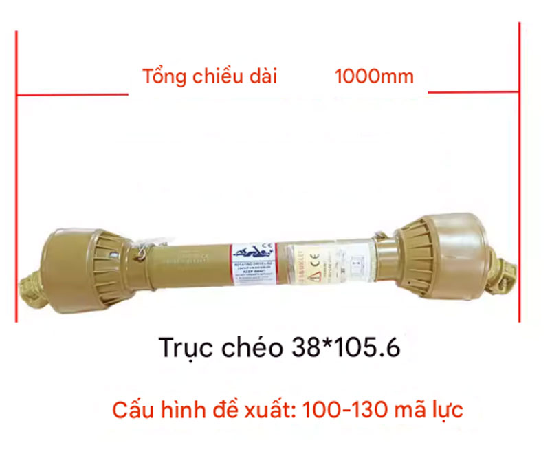 Ống lồng truyền lực có thể có dạng tam giác, hình ống tròn hoặc ống hoa tùy model, với khả năng kéo dài/thu gọn linh hoạt để phù hợp với từng loại máy và khoảng cách lắp đặt. Lớp vỏ bảo vệ an toàn bằng nhựa ABS/PVC bao bọc toàn bộ phần trục quay, kèm hệ thống vòng chắn chống xoay và các chốt khóa an toàn đạt tiêu chuẩn Châu Âu CE.