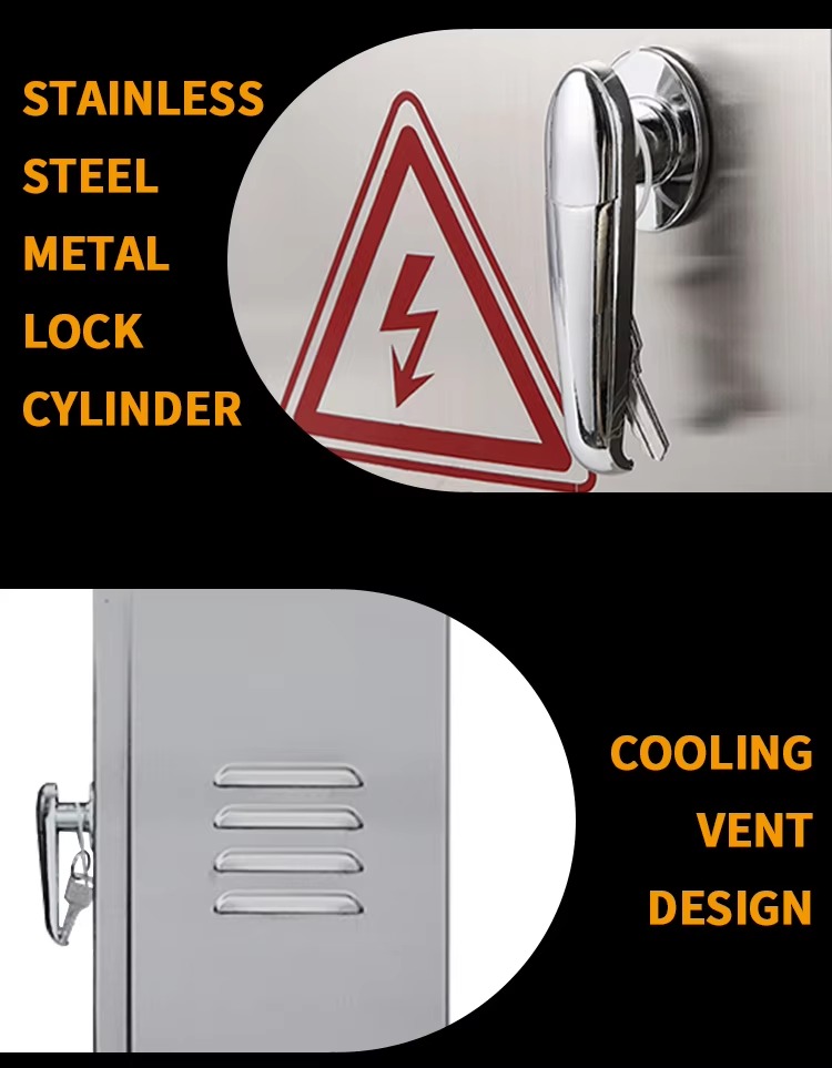 Thân tủ được chế tạo từ inox 304 chất lượng cao, có khả năng chống gỉ sét, chống ăn mòn và chịu được điều kiện môi trường khắc nghiệt như mưa, nắng, độ ẩm cao hoặc khu vực có hóa chất nhẹ. Vật liệu inox 304 giúp tủ có độ bền cơ học cao, hạn chế oxy hóa và duy trì tuổi thọ lâu dài khi lắp đặt ngoài trời.