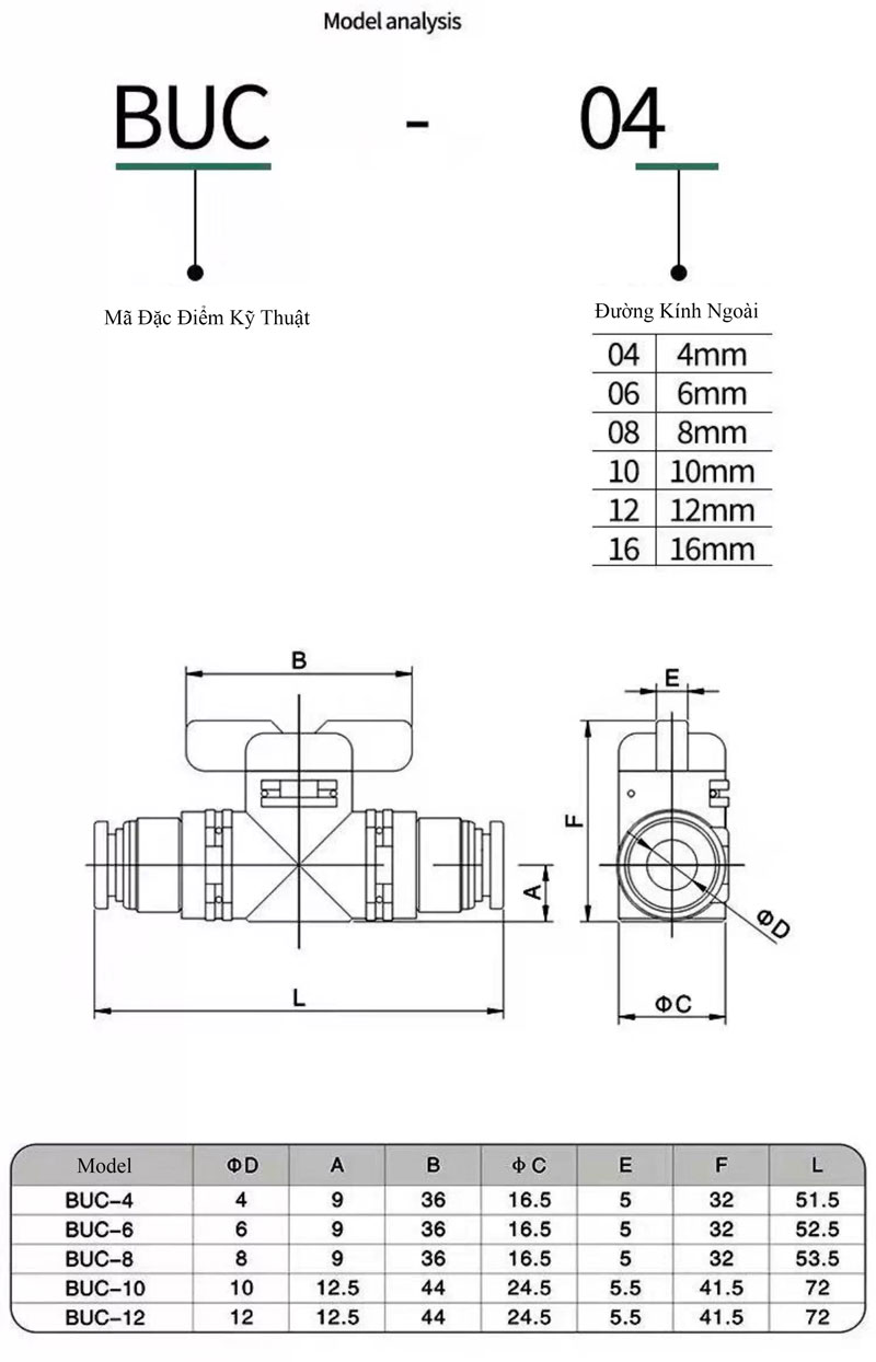 Mô tả chi tiết Van Bi Khí Nén Tay Gạt BUC 4/6/8/10/12mm