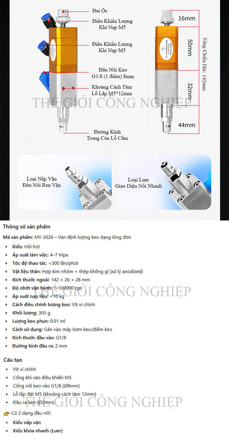 Van MY2626 cho phép điều chỉnh lượng keo ra ổn định theo thời gian và áp suất khí nén, phù hợp cho các ứng dụng công nghiệp như: chiết keo epoxy, silicone, UV, keo dán linh kiện điện tử, sản phẩm nhựa, thủ công mỹ nghệ, hay chiết keo phủ bề mặt.