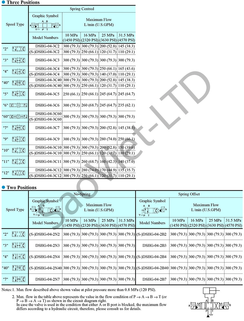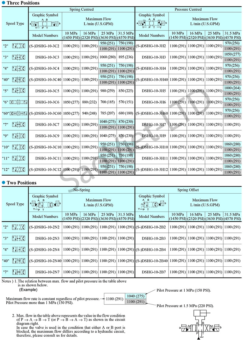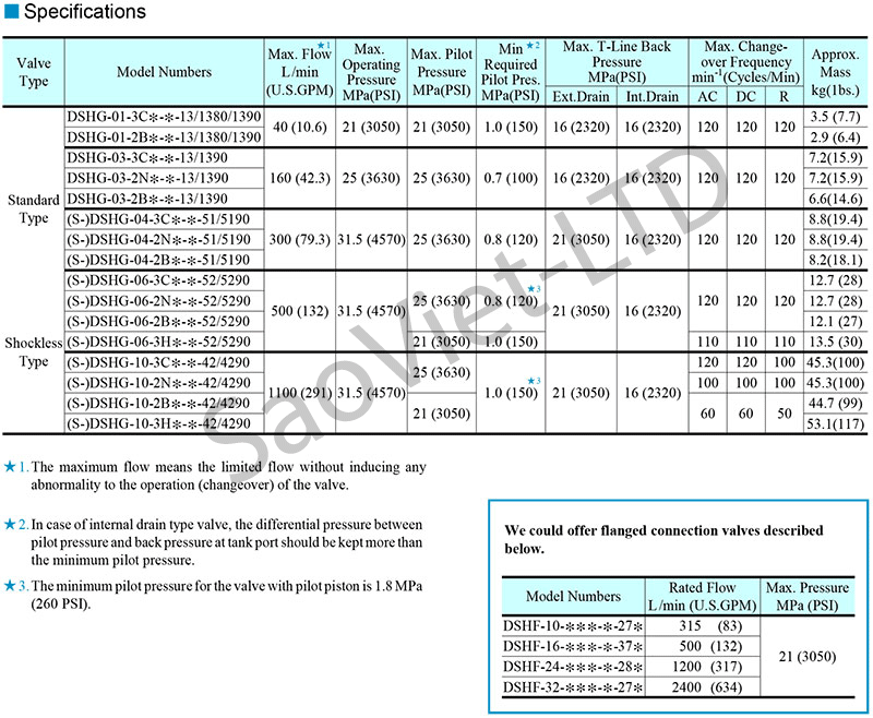 Van có nhiều model tương ứng với các cấp lưu lượng khác nhau (từ DSHG-01 đến DSHG-10), đáp ứng dải lưu lượng từ 40 đến 1100 L/min và áp suất tối đa lên tới 31.5 MPa. Hoạt động bằng điện áp đa dạng như AC 220V, DC 24V. Van có thể điều khiển 2 vị trí hoặc 3 vị trí tùy mục đích sử dụng. Kết nối dạng lắp mặt bích tiêu chuẩn công nghiệp.