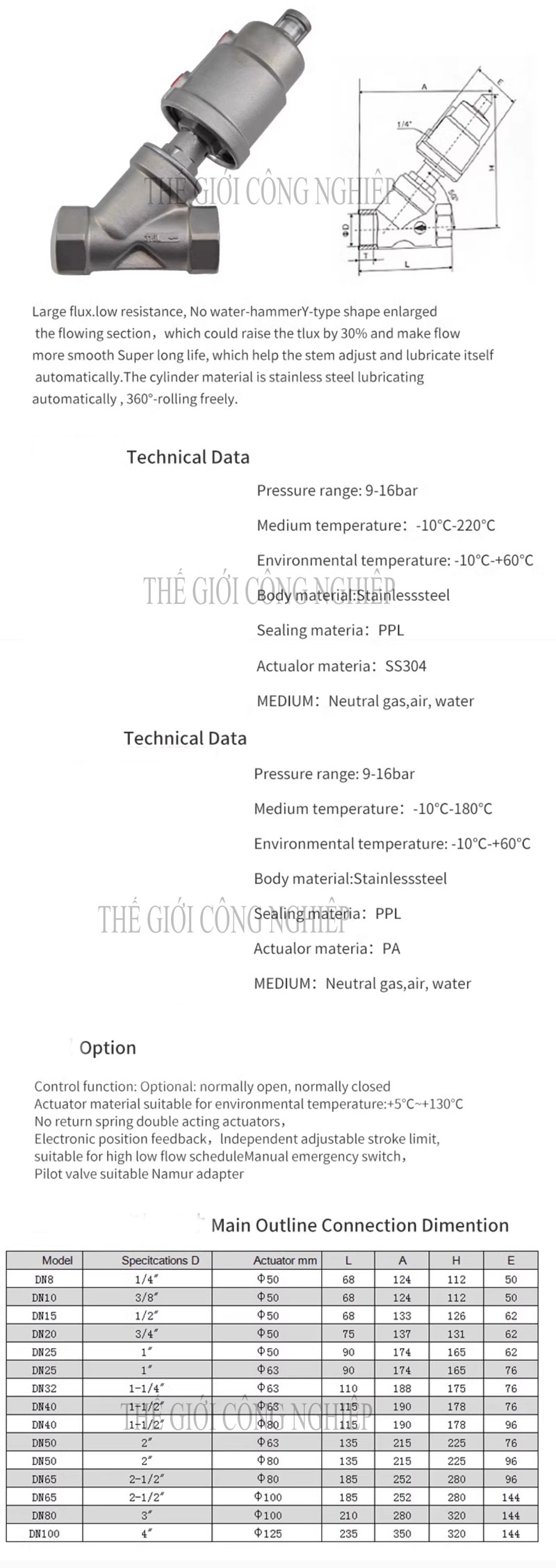 Van góc khí nén inox 304 là loại van điều khiển tuyến tính được thiết kế để đóng/mở dòng chảy môi chất một cách nhanh chóng và chính xác thông qua tác động của xy lanh khí. Với kết cấu chắc chắn, vật liệu inox 304 cao cấp và thiết kế góc 90 độ đặc trưng, van phù hợp cho nhiều ứng dụng tự động hóa trong các hệ thống cấp thoát nước, khí nén, hơi nước, dung dịch hóa chất loãng và thực phẩm.
