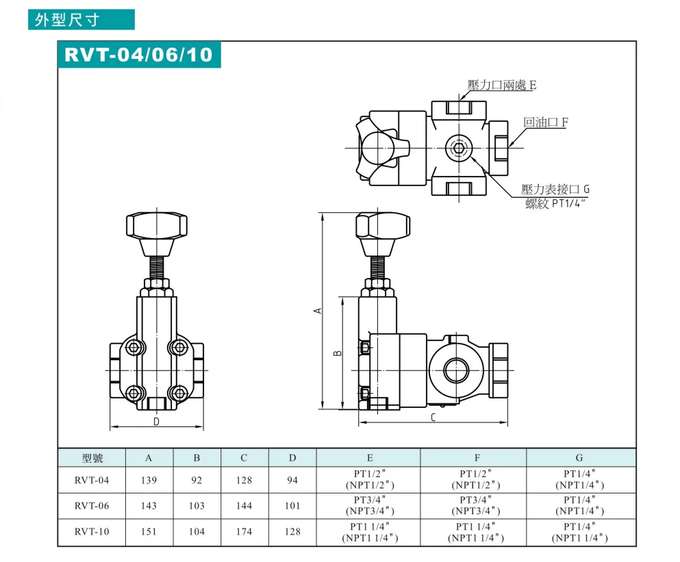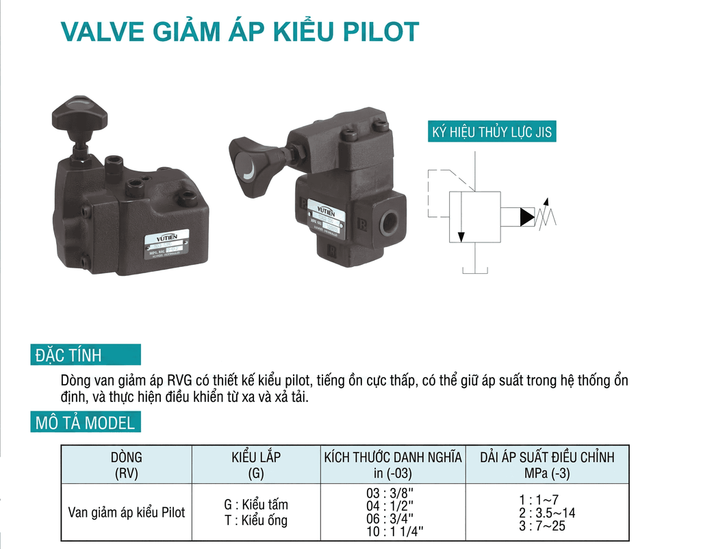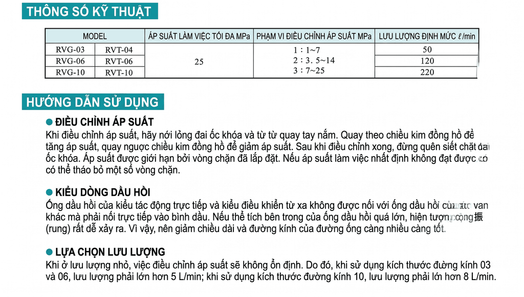 Dòng RVT được thiết kế đa dạng kích thước (03, 04, 06, 10) và cấp áp suất (1/2/3), phù hợp với nhiều loại hệ thống từ nhỏ đến lớn.