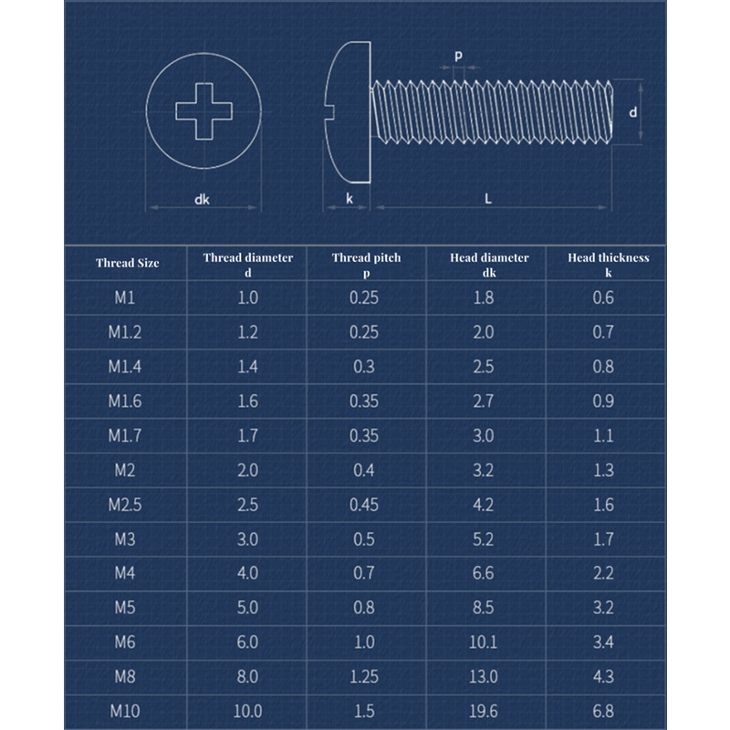 Bảng Thông Số Kỹ Thuật Vít Đầu Tròn Chữ Thập Bằng Thép Không Gỉ 304 m1 m1.2 m1.4 m1.6: