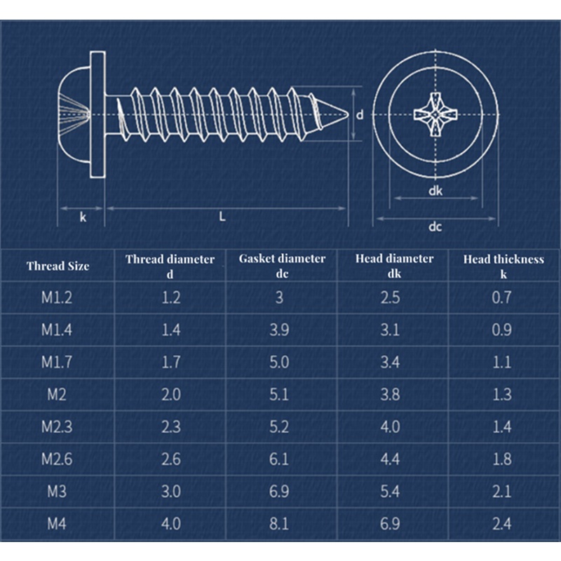 Bảng Thông Số Kỹ Thuật Vít Đầu Tròn Chữ Thập Đen m1.2 m1.4 m1.7 m2 m2.3 m2.6 m3 m4: